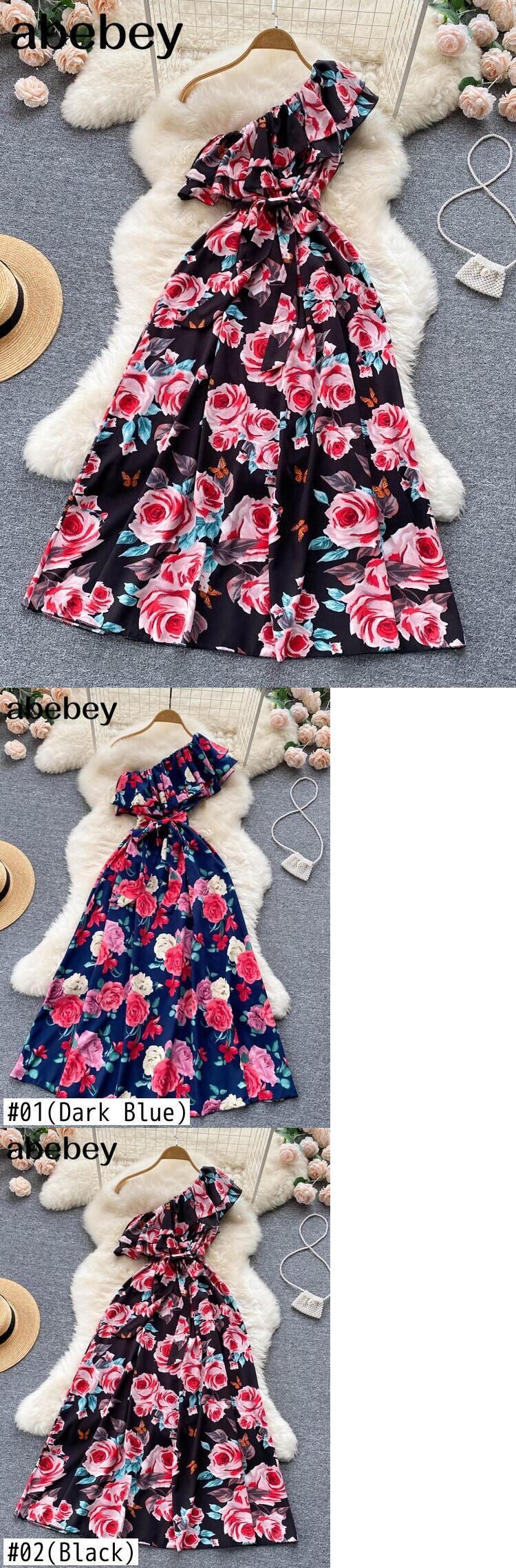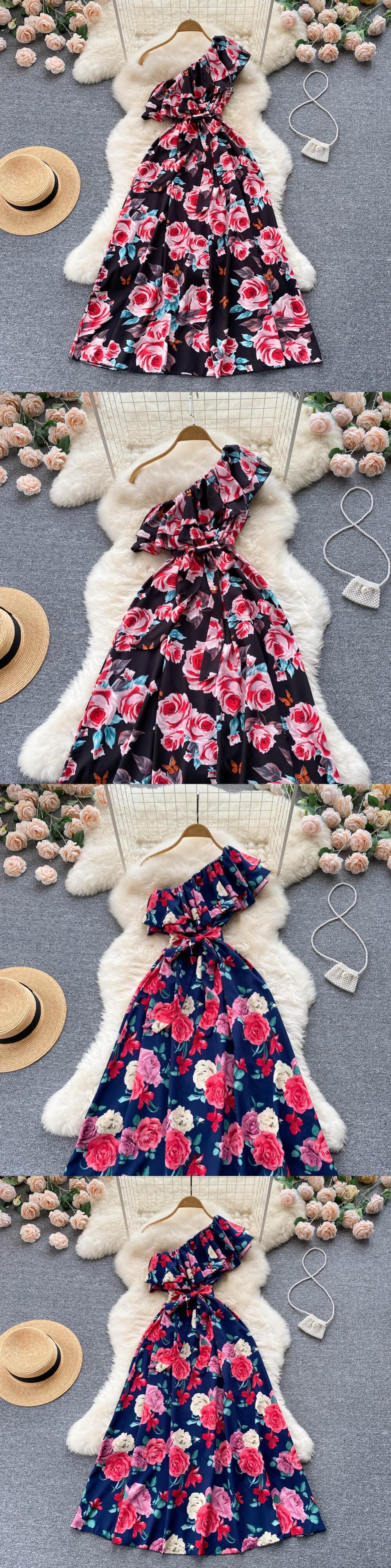 2022 女性シフォン花ロングドレスワンショルダーノースリーブシャーリング A ラインドレス夏ボヘミアンプリントビーチドレス サマー 夏物 花柄 Aライン Abe32144316646