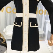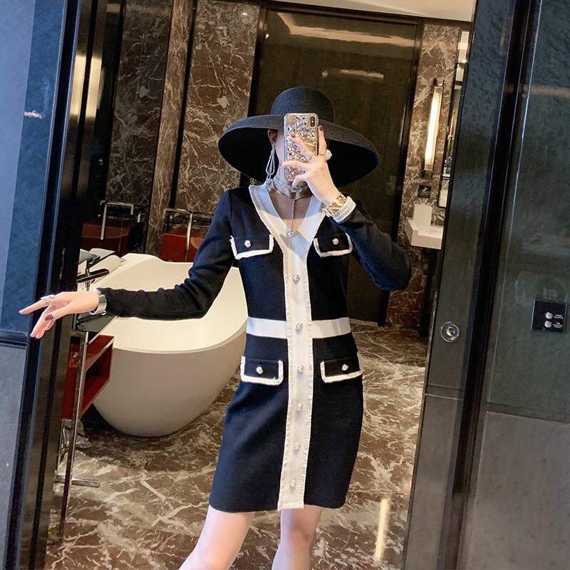 秋 2022 フレンチ V ネックと長袖ニット ドレス女性スリム ウエスト フェイク ポケット衣装 ロング オータム 秋物 ファー Vネック Abe17584152040