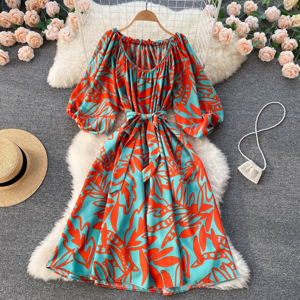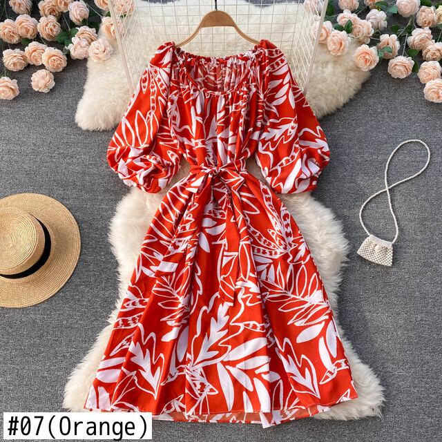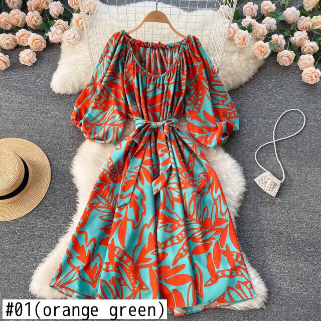 女性のプリントドレスパフスリーブサッシAラインシフォンドレス夏ボヘミアンプリントビーチサンドレス サマー 夏物 Abe54472690421