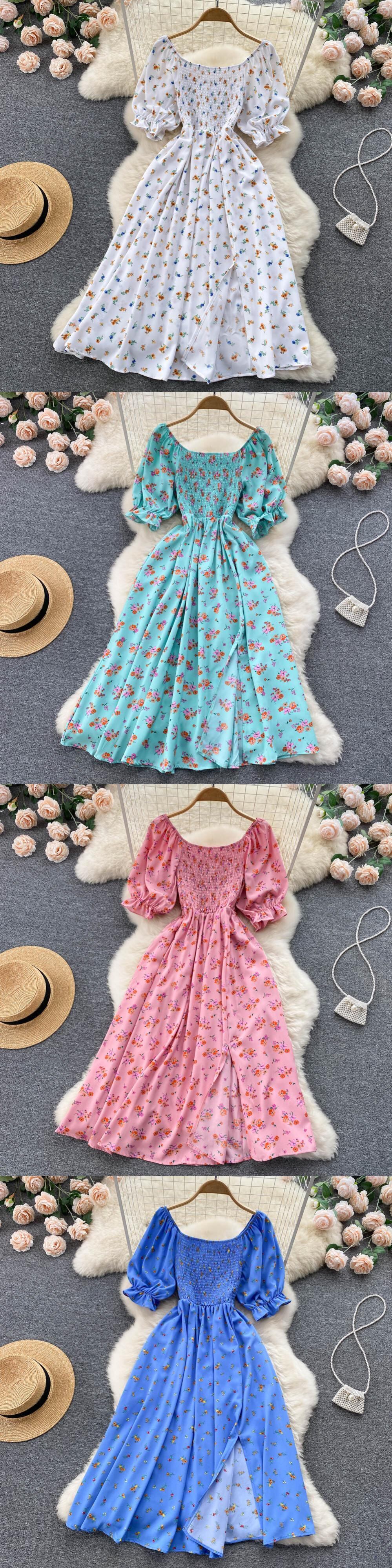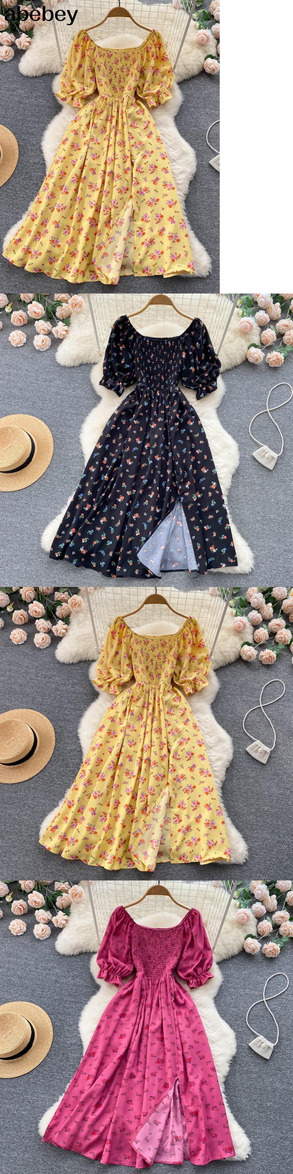 ショートパフスリーブ Flroal プリントシャーリングパーティー女性のサマードレスロングマキシドレス巾着セクシーな Vestidos サンドレス 夏物 Abe6867476698
