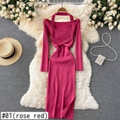 ホルターネックニットドレス女性弾性スリム長袖ミディドレス秋冬セクシーなボディコンスプリットセータードレス ロング エラスティック 伸縮 オータム 秋物 ウィンター 冬物 Abe22005508803