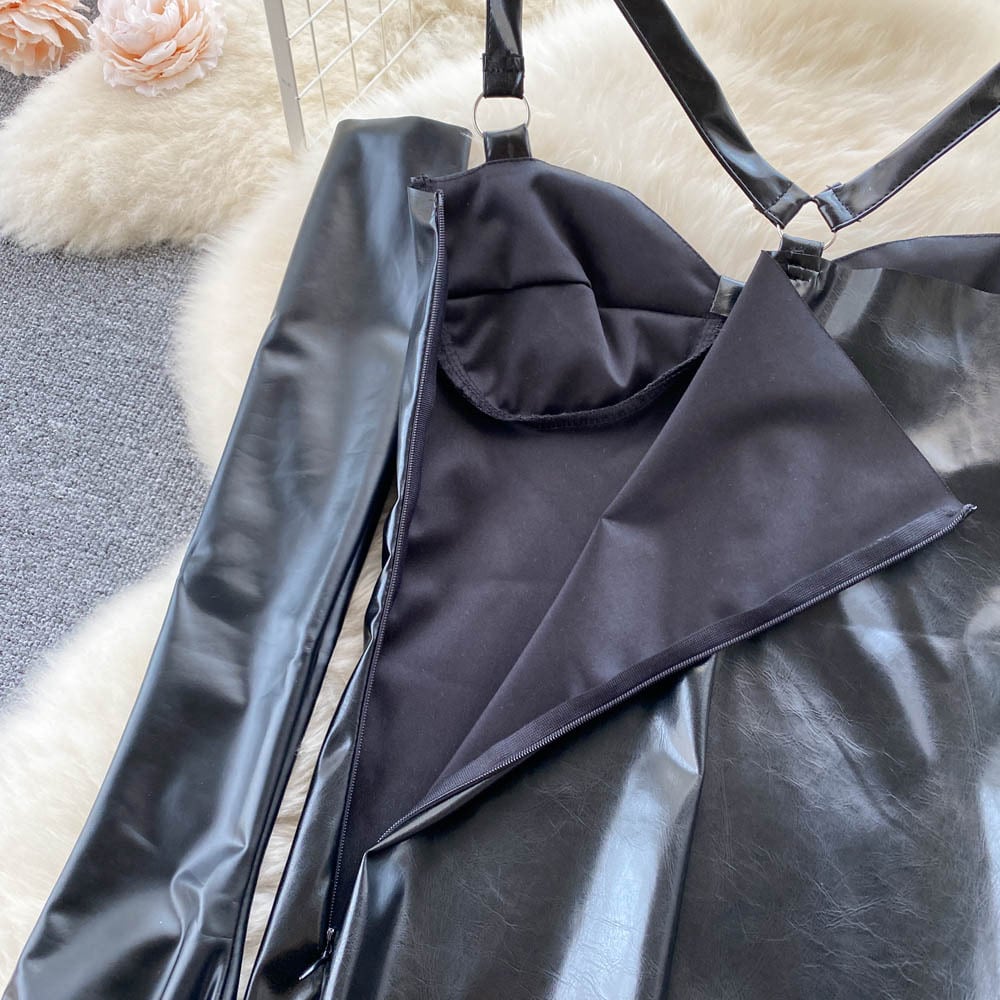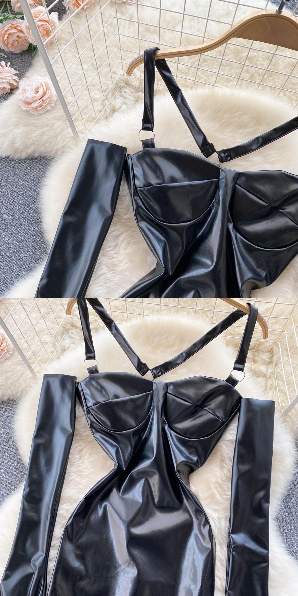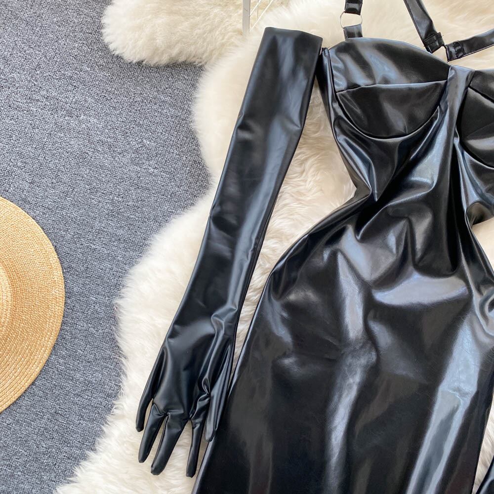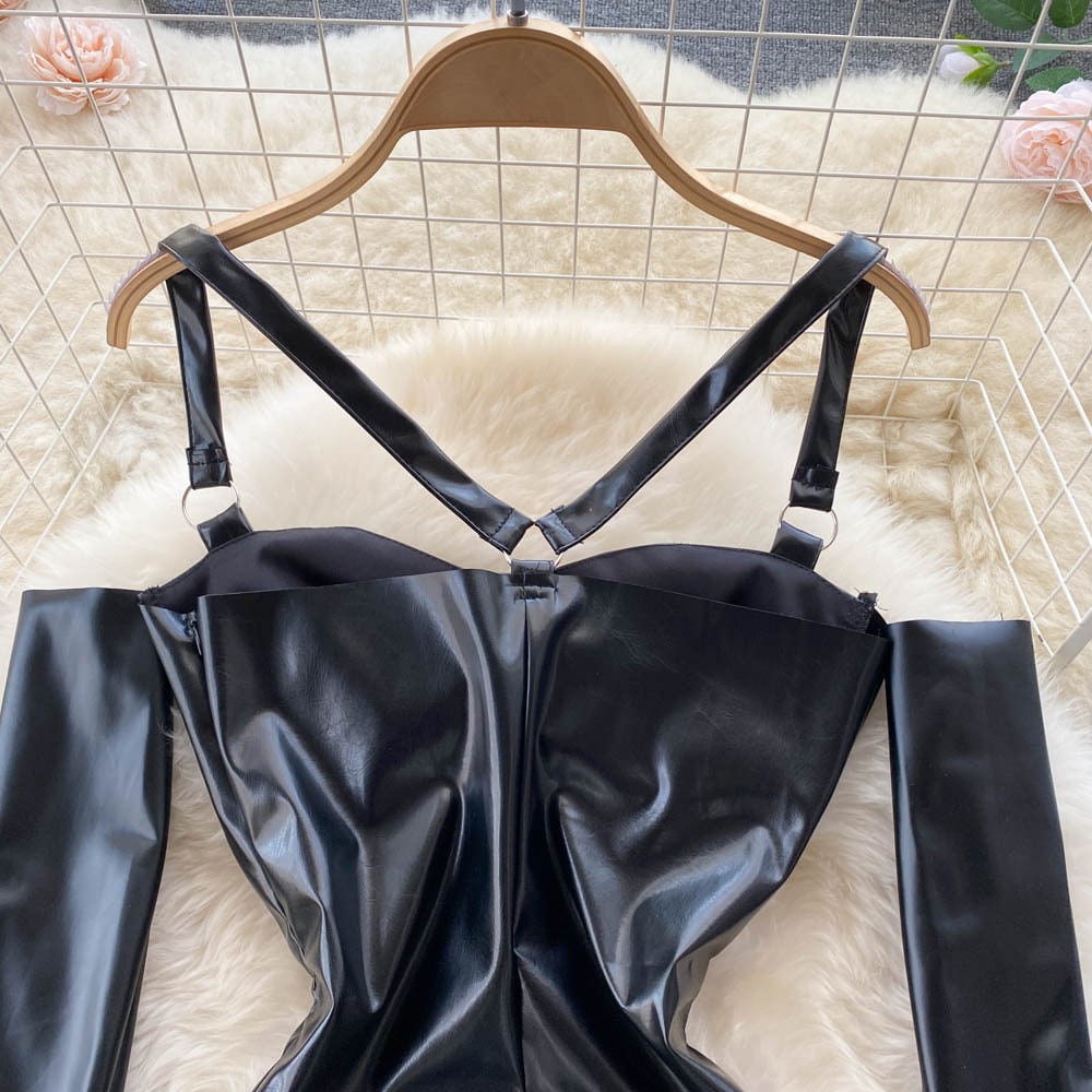 2022 女性 PU ストラップドレススラッシュネックセクシーなオフショルダー黒ドレス夏パッチワークボディコンサンドレス ブラック サマー 夏物 Abe40698771454