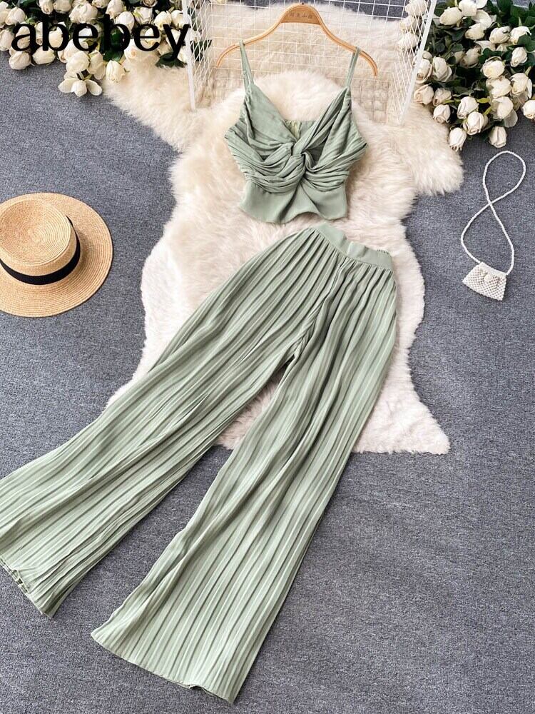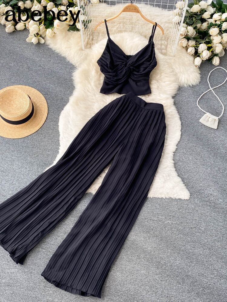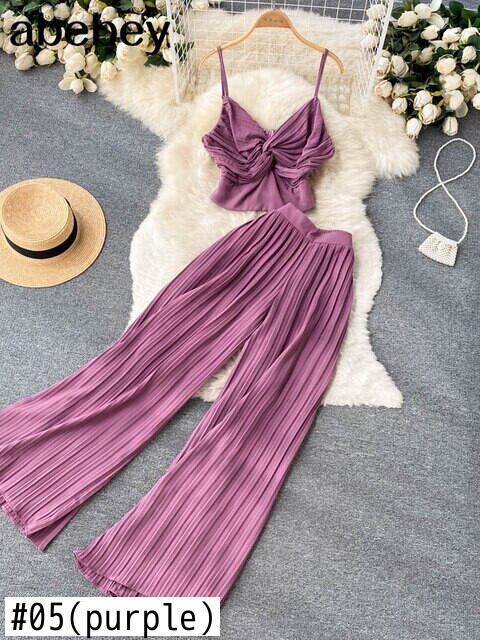 女性パンツセットボディコンスリムショートタンクトップ+ストライプワイドレッグロングパンツソリッドサマーツーピーススーツ 夏物 ワイドパンツ ソリッドカラー Abe6725320905