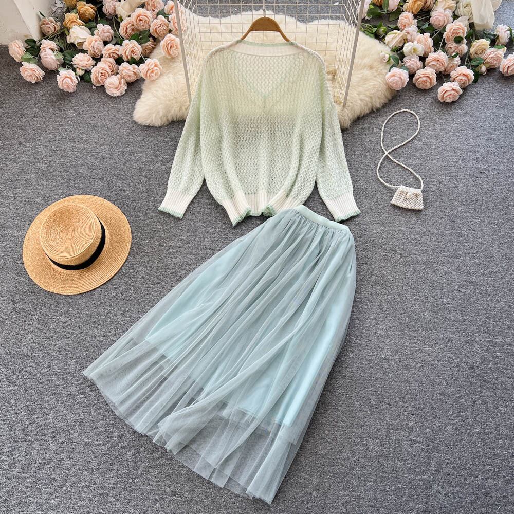 冬のツーピースセットボヘミアンバケーションビーチ 2 個セット女性長袖セーターとウエストプリーツメッシュロングスカートスーツ ウィンター 冬物 Abe85307713345