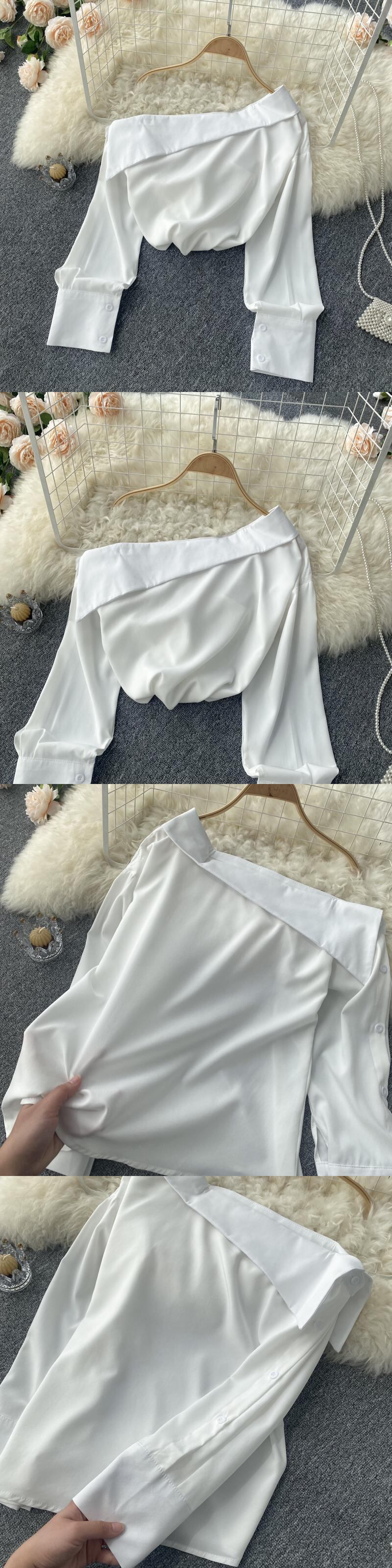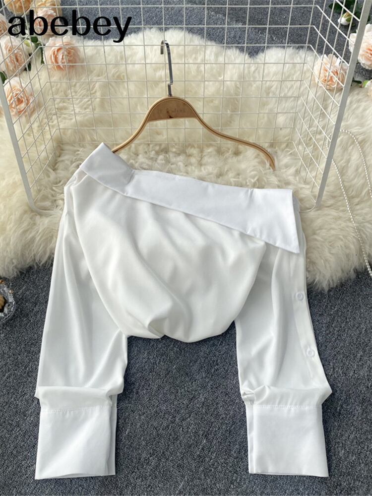 2022 ワンショルダーブラウス弾性シャーリングスリム無地トップス女性のセクシーな白/黒の基本的なブラウス秋 ホワイト ブラック エラスティック 伸縮 オータム 秋物 ソリッドカラー Abe82104750347