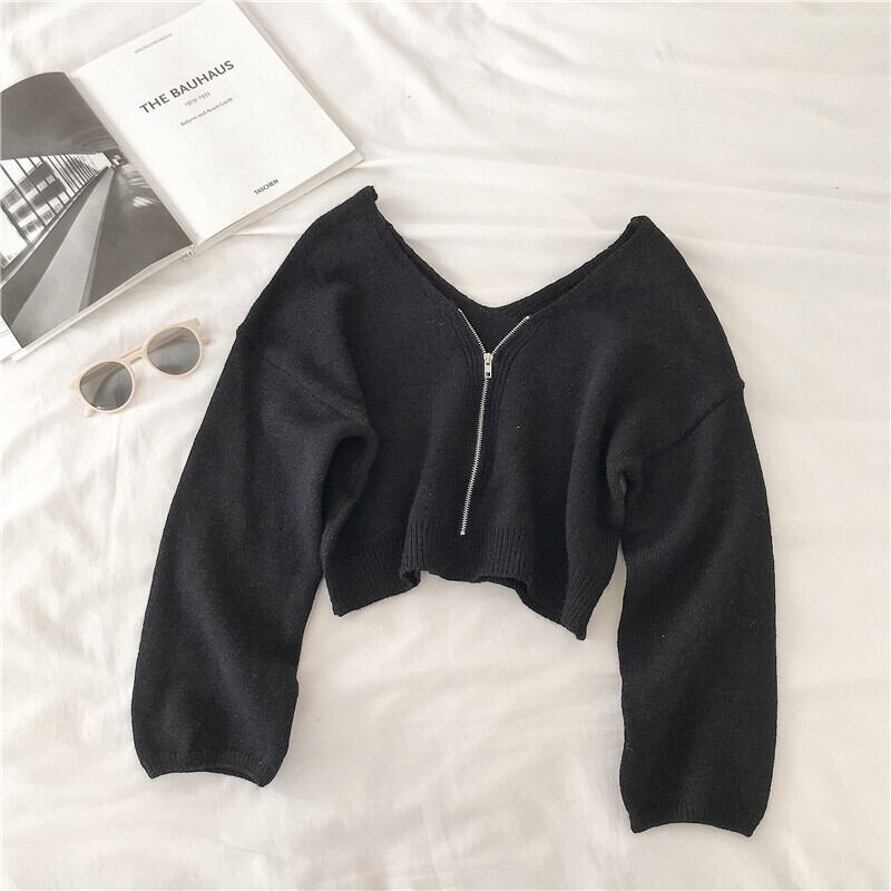 長袖'冬トップス女性シックなジッパーニットセーター女性白黒ショートセーターレディース 2022 秋 ロング ホワイト ブラック オータム 秋物 ウィンター 冬物 Abe36905032016