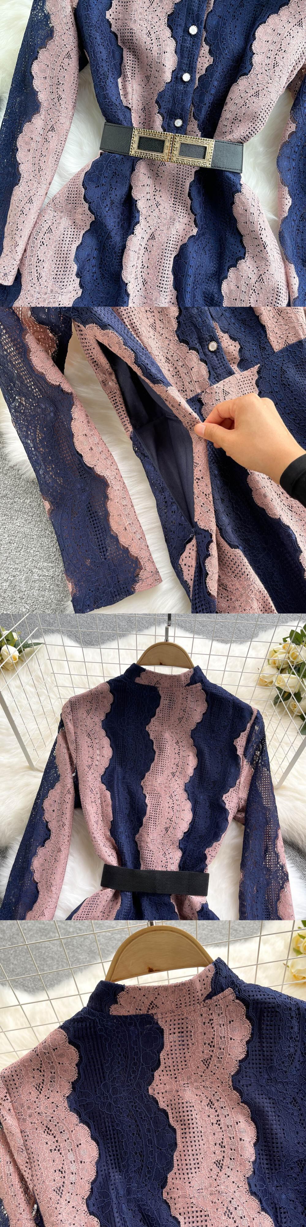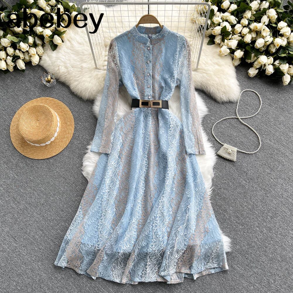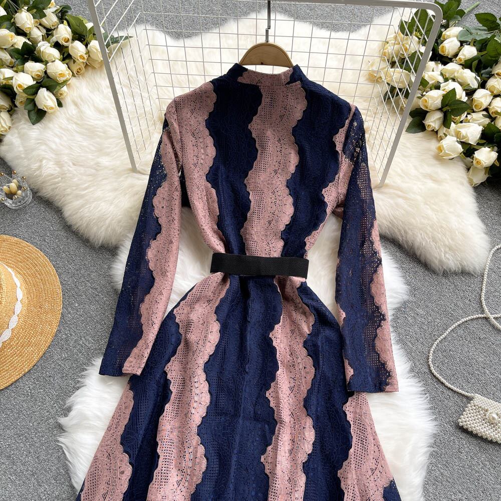 秋のフレンチ中空ドレス長袖 O ネックベルト A ラインドレスストリート女性ドレス 2022 ロング オータム 秋物 ハーネス Oネック Aライン Abe14218519885