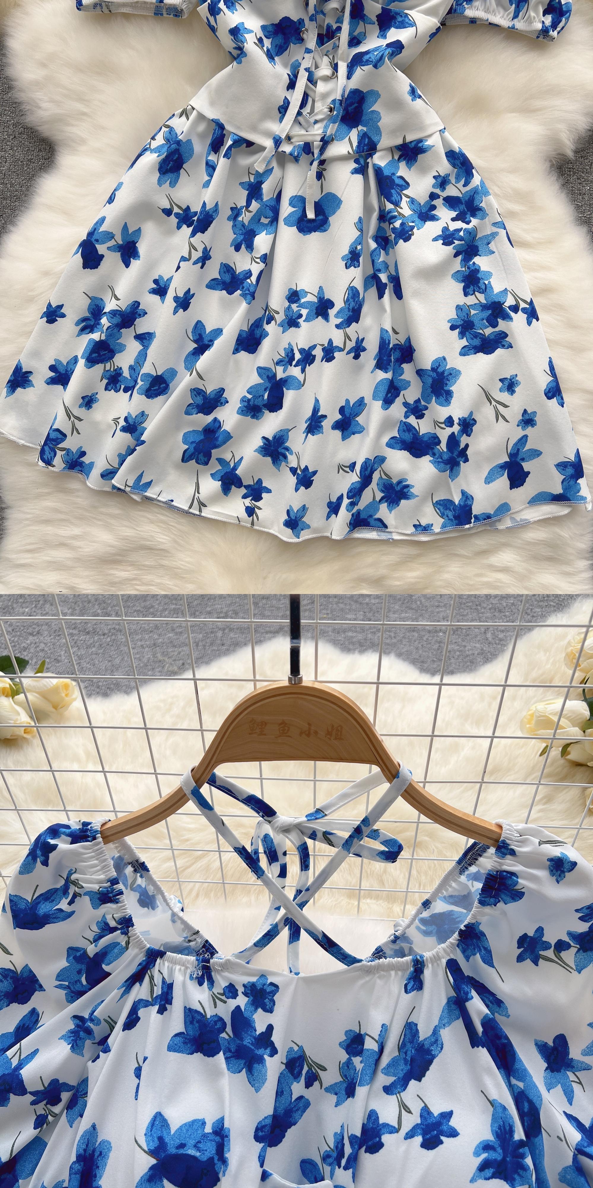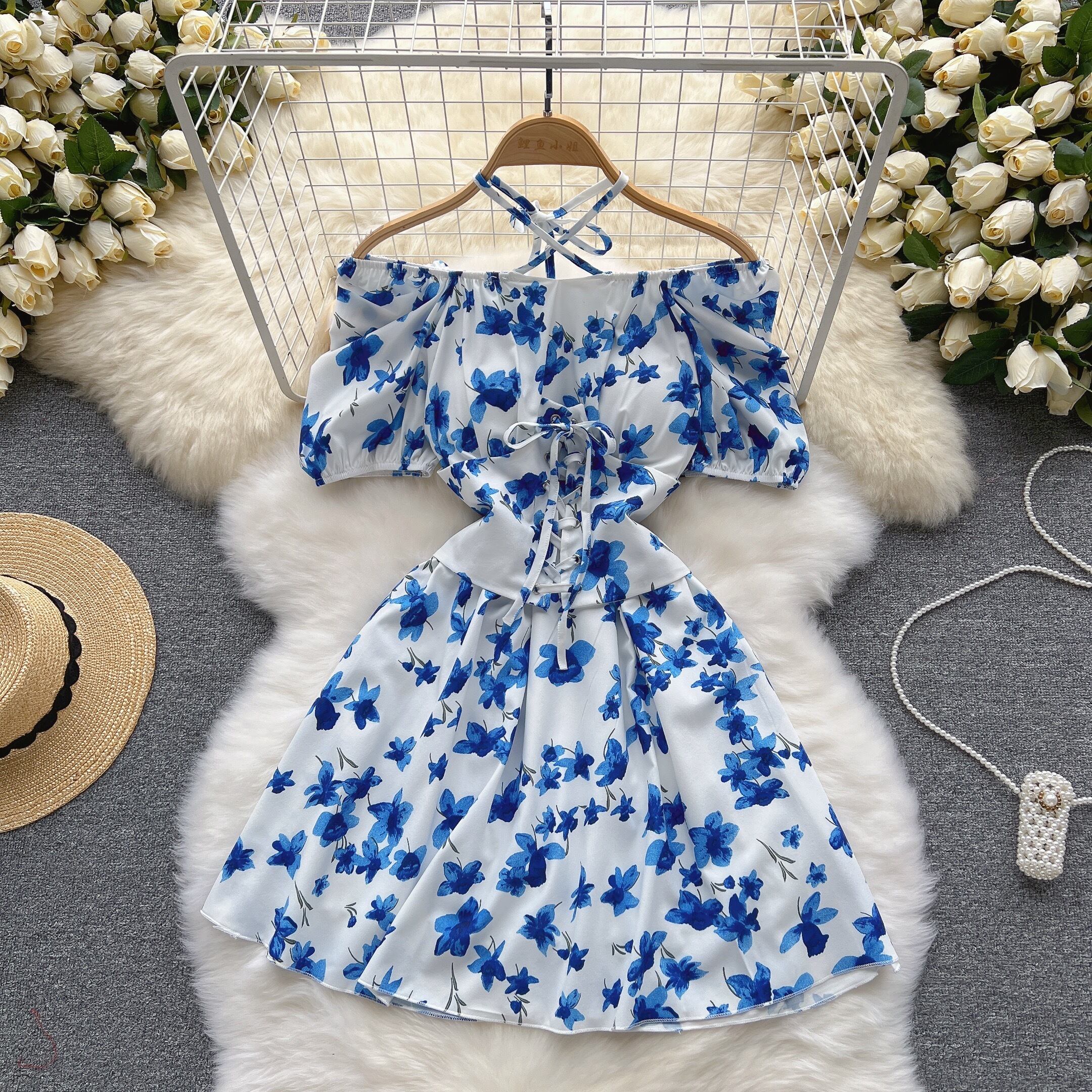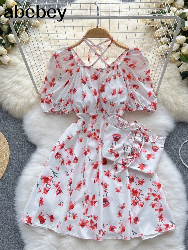 夏の女性ホルターベルトウエストスリムバブルスリーブ花柄ドレス甘い半袖 A ラインドレス ショート ハーフスリーブ 大人ガーリー スウィート キュート カジュアル サマー 夏物 ハーネス Aライン Abe51411916318