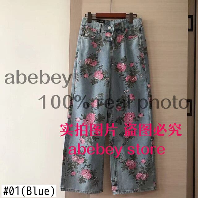 ローズフラワージーンズ女性レトロウエストパンツ秋のストリートワイドレッグデニム長ズボン ロング オータム 秋物 ワイドパンツ フラワーデザイン Abe32286057561