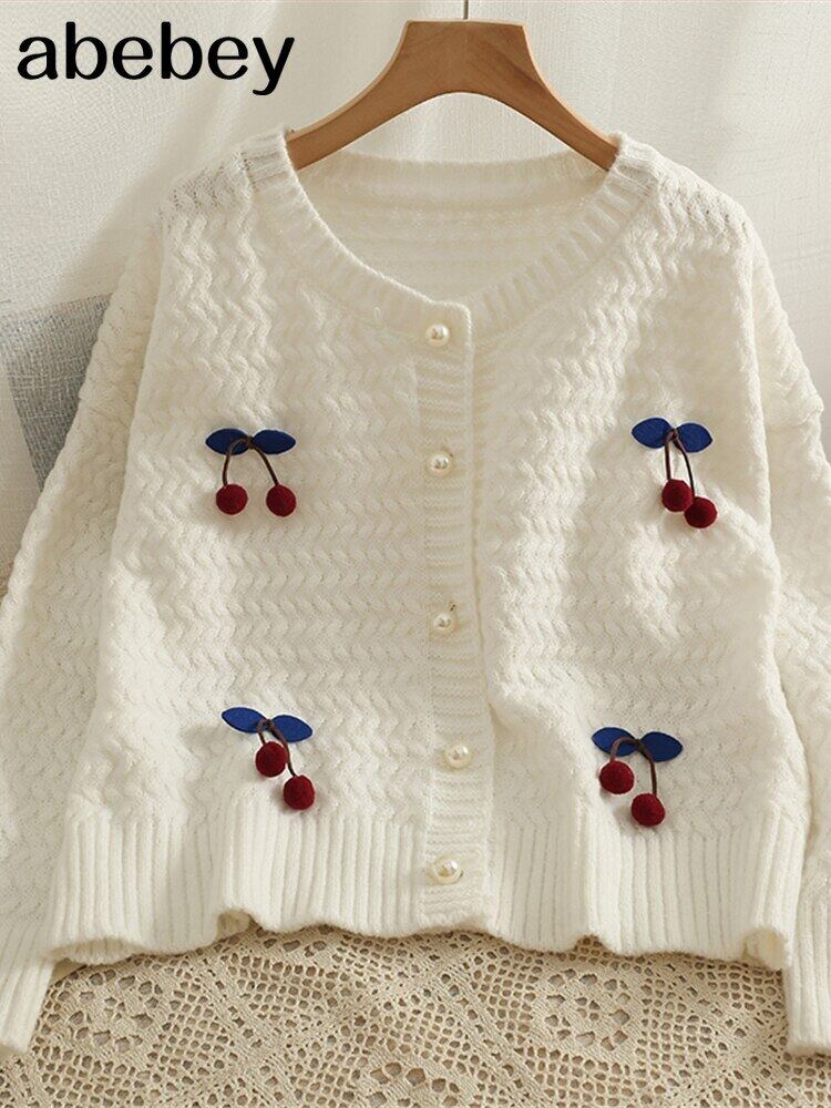刺繍女性カーディガンアップリケチェリースウィートガールズカーディガンソリッド春秋カーディガンシングルブレスト 大人ガーリー キュート カジュアル スプリング 春物 オータム 秋物 ソリッドカラー Abe70548646667