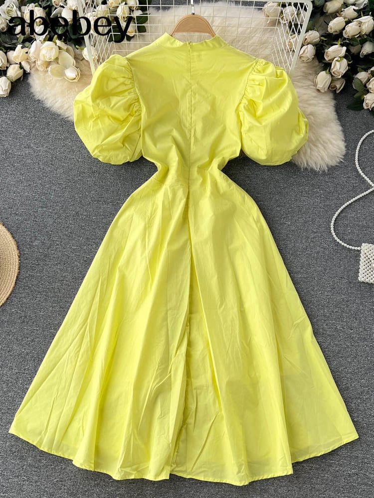 女性ロングドレス夏 O ネックパフ半袖ウエストビッグスイング A ラインパーティーマキシローブ ショート ハーフスリーブ サマー 夏物 Oネック Aライン Abe44565930117