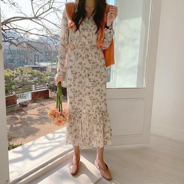 シャーリング花柄の女性のサマードレスセクシーな V ネックフルスリーブロングドレス 2022 夏シフォン Vestidos 夏物 Vネック Abe51483184923