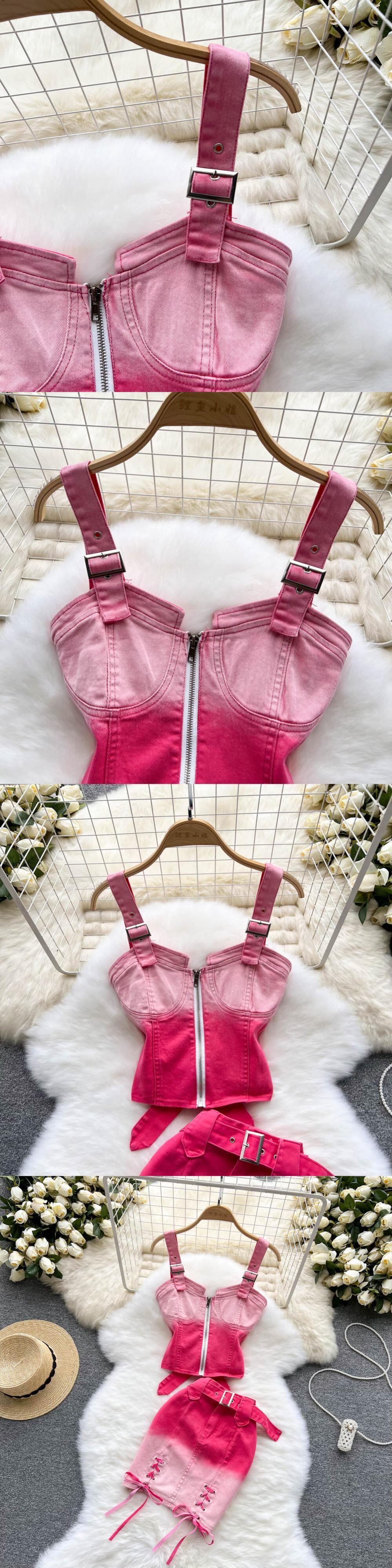 夏の女性 2 2 個セットセクシーな V ネックジーンズベスト + ウエストベルトデニムスカートスタイルオフィスレディノースリーブスーツ サマー 夏物 ハーネス Vネック 会社 学校 通勤や通学にも Abe94031749849