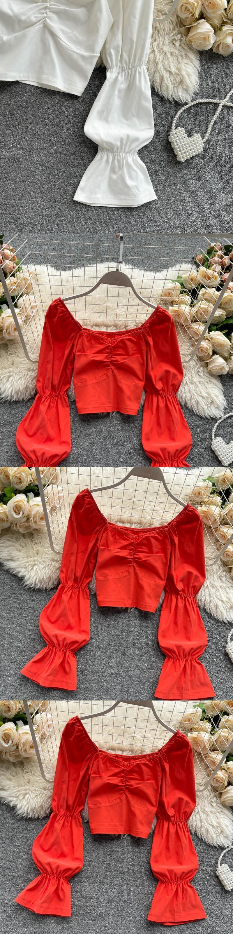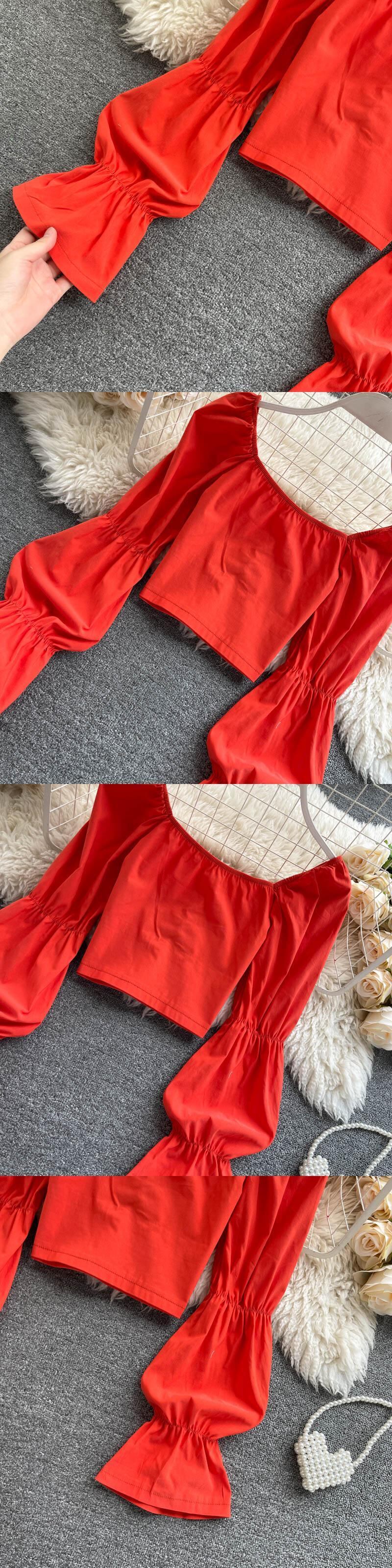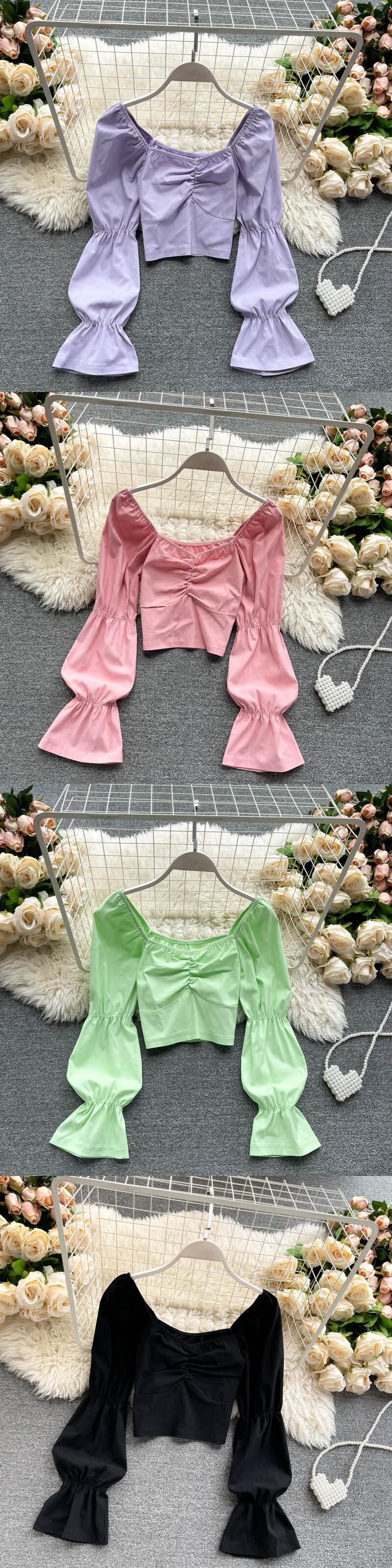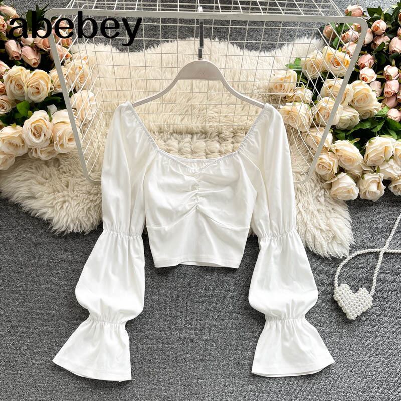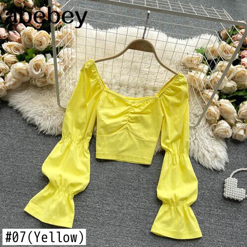 女性ボヘミアンソリッドブラウススタイルスウィートスクエアカラースリムショートトップス春弾性シャーリングストリートブラウス エラスティック 伸縮 大人ガーリー キュート カジュアル スプリング 春物 ソリッドカラー スクウェア Abe18088413665
