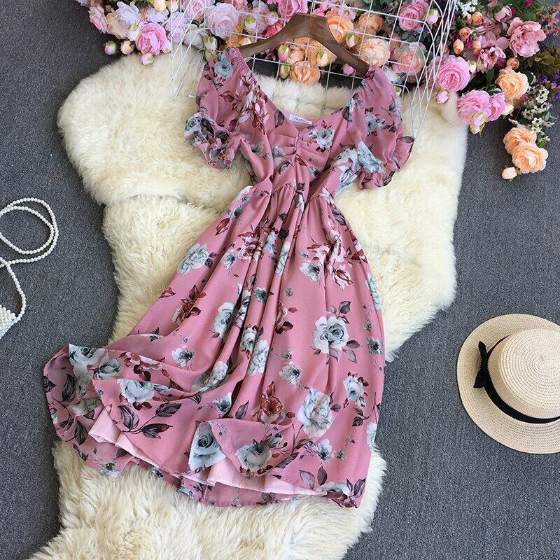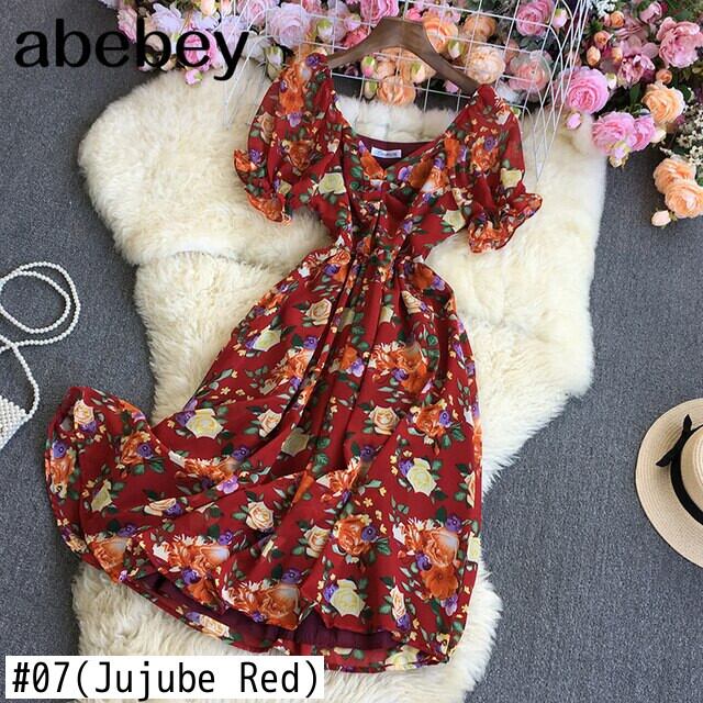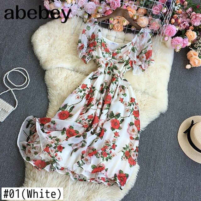 2022 春秋フレンチ V ネック半袖ドレス ハイウエスト プリーツ ウエスト花柄プリント ミッドレングス A ライン ドレス ハイウェスト ショート ハーフスリーブ スプリング 春物 オータム 秋物 Vネック Aライン Abe93965512865