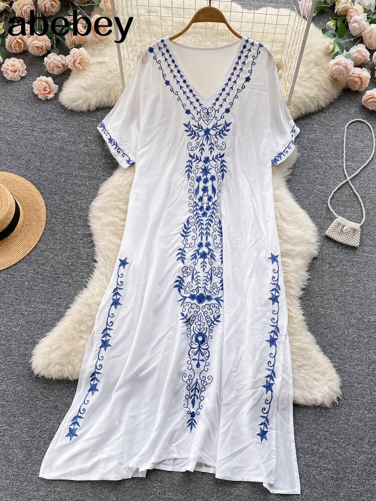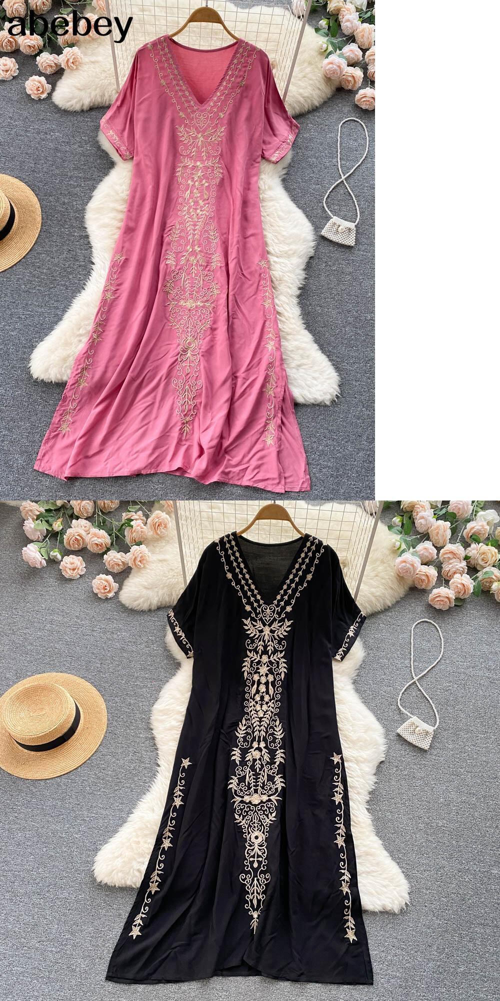 2022 ブラック/ホワイト/ピンク中空アウト刺繍マキシドレス女性 V ネック半袖ウエスト A ラインパーティー Vestidos ショート レッド ハーフスリーブ Vネック Aライン Abe16810684491