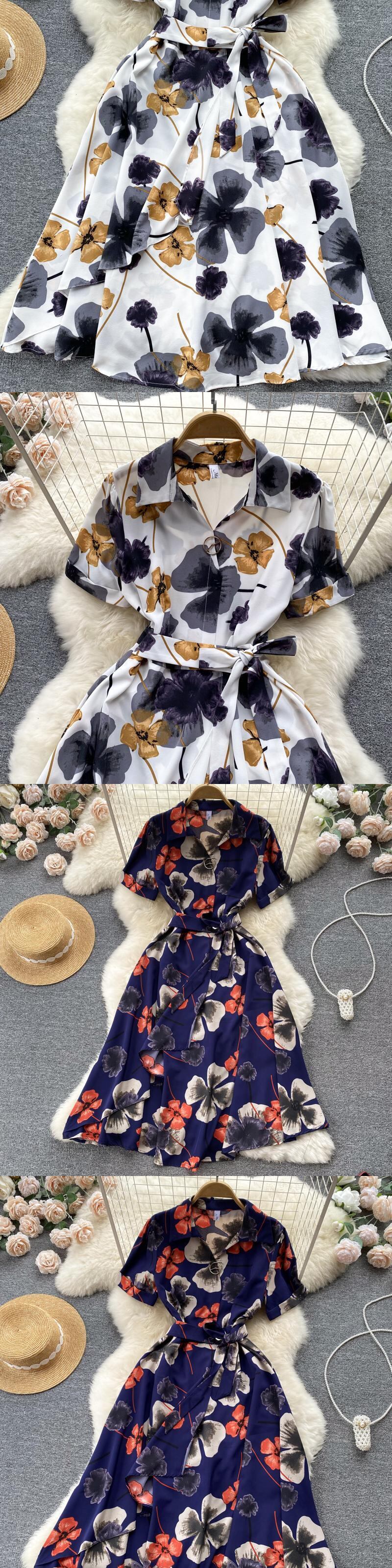 夏の女性の花ミディドレスブルー半袖ウエスト A ラインフラワープリント Vestidos 休暇ビーチローブ ショート ハーフスリーブ サマー 夏物 花柄 Aライン フラワーデザイン Abe66752261579