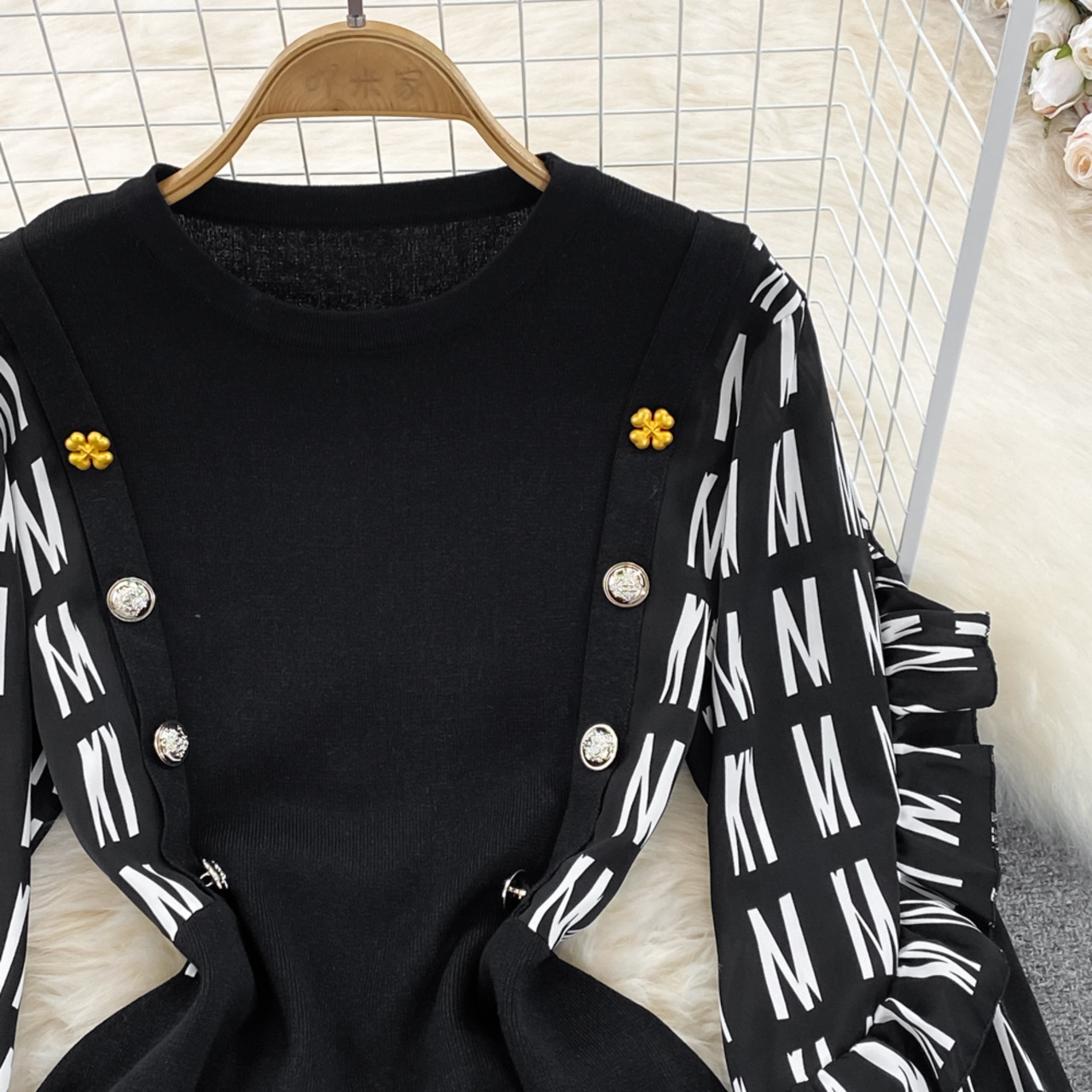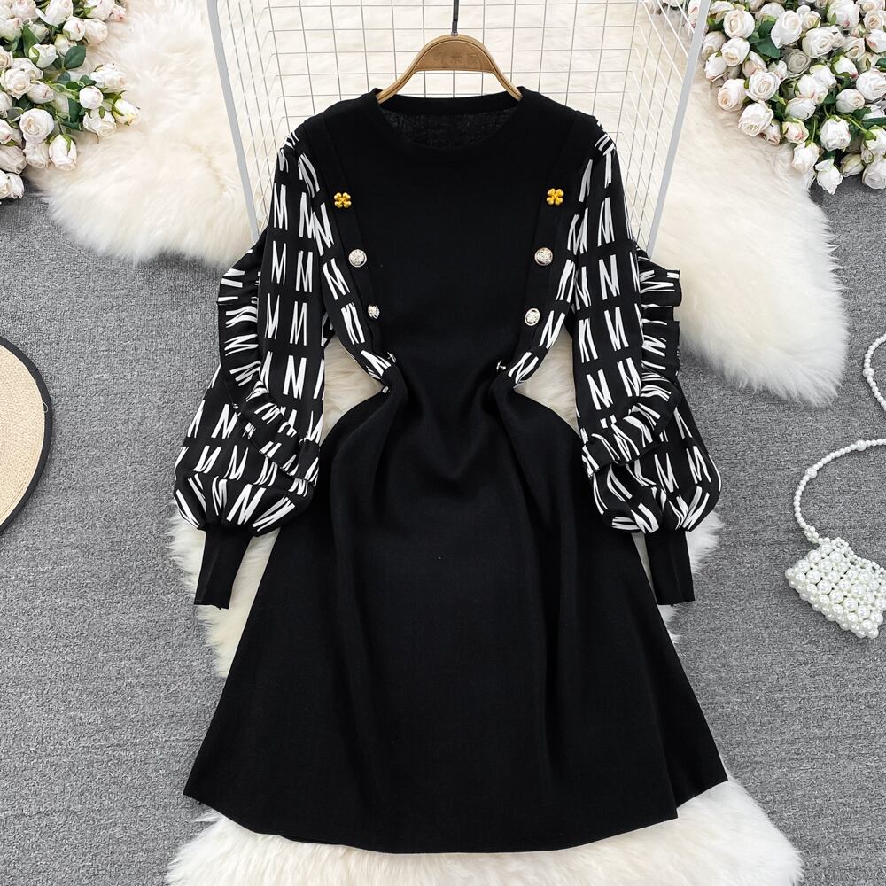 女性秋長袖プリントパッチワークミディドレス滑走路オフィスウエスト A ライン Vestidos ロング オータム 秋物 Aライン 会社 学校 通勤や通学にも Abe32918949976