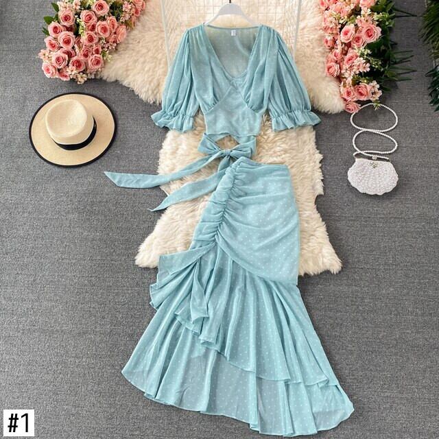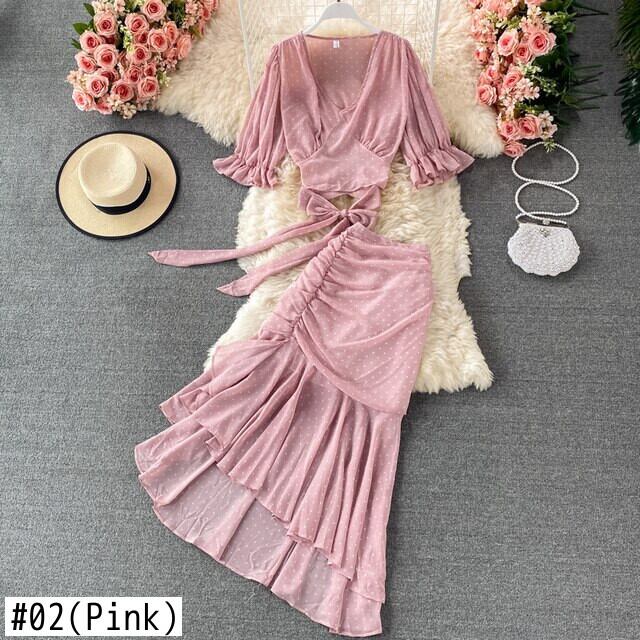 女性夏自由奔放に生きるソリッドレースビーチセットパフスリーブショートトップス + ウエストロングスカートツーピーススーツ サマー 夏物 ソリッドカラー Abe37924933186