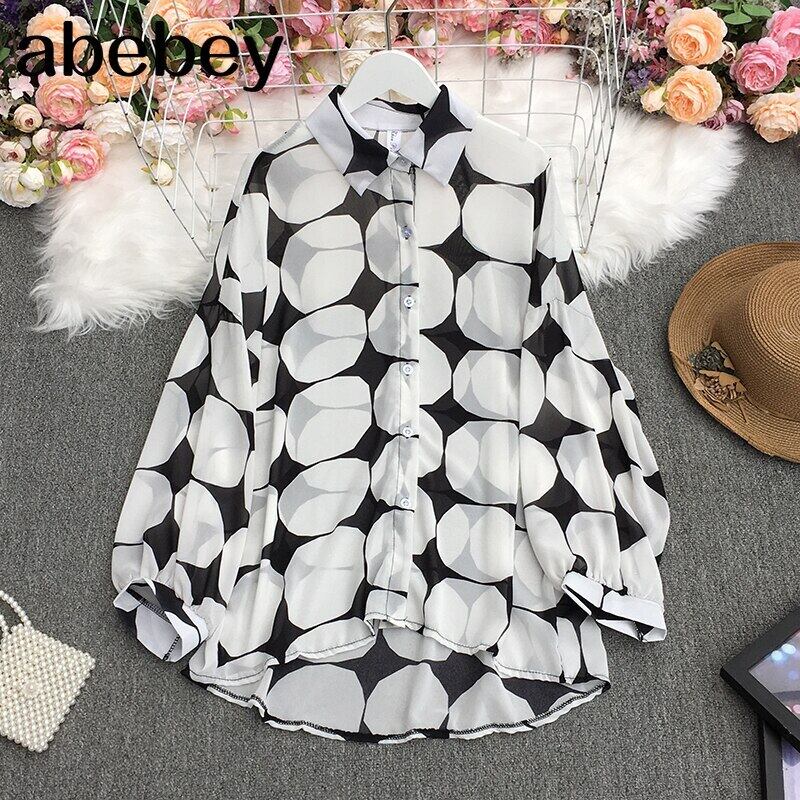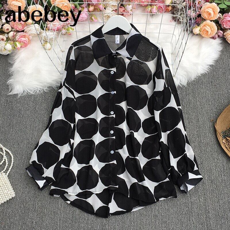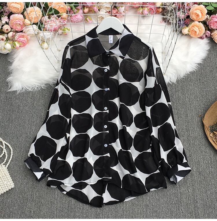 2022春夏気質ターンダウンカラー長袖シャツ水玉プリントルーズカジュアルシャツトップ ロング スプリング 春物 サマー 夏物 Abe42100584932