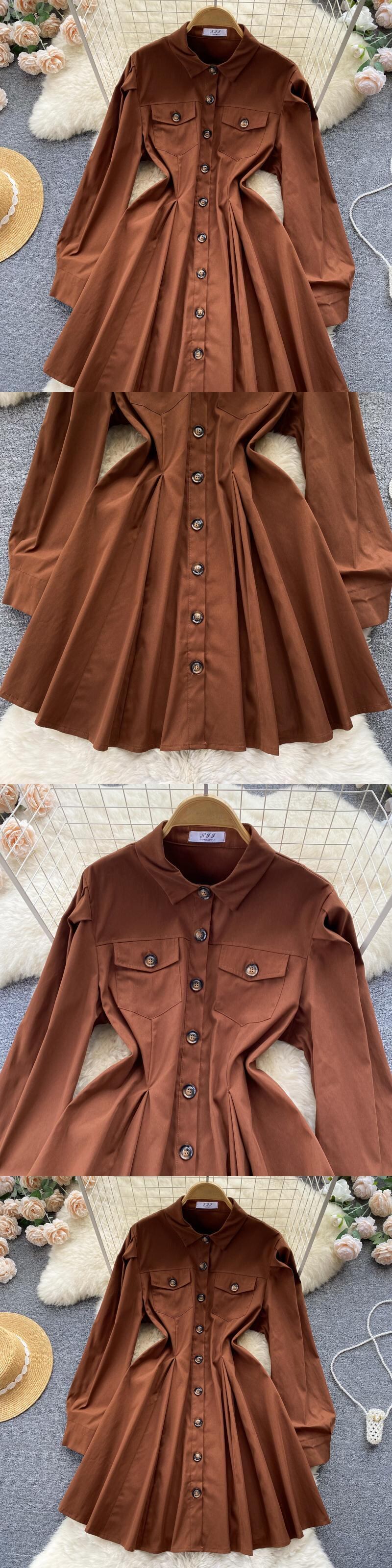 2022 春の女性のドレスソリッドターンダウンカラー長袖シングルブレストポケット A ラインミニワークパーティードレス ロング スプリング 春物 Aライン ソリッドカラー Abe48663646908