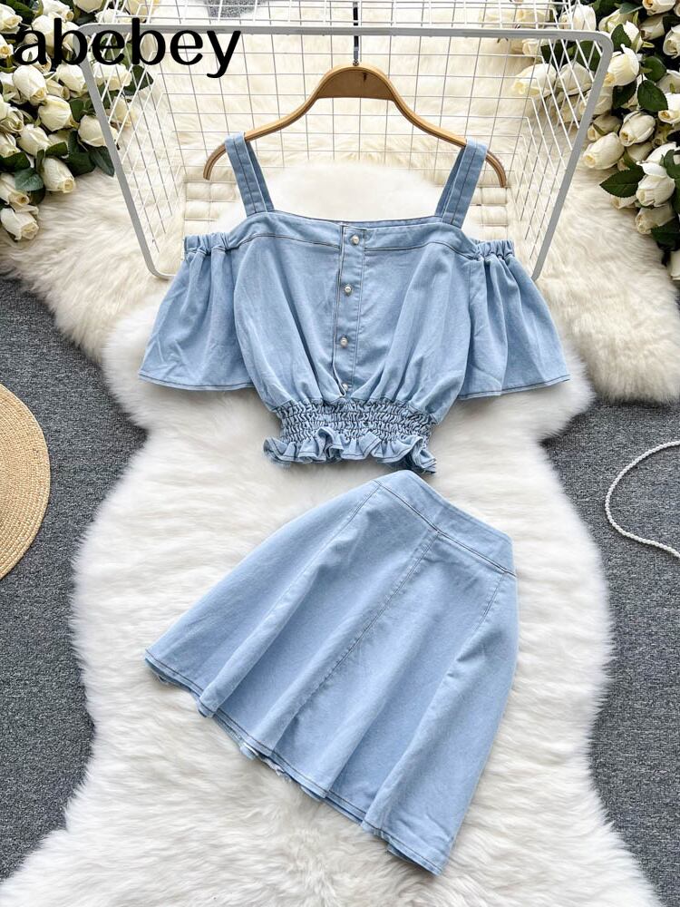 夏のストリートデニム 2 2 peice セットスカート女性ボタンクロップトップミニスカートショートマッチングセット 2022 衣装 サマー 夏物 Abe10385682023