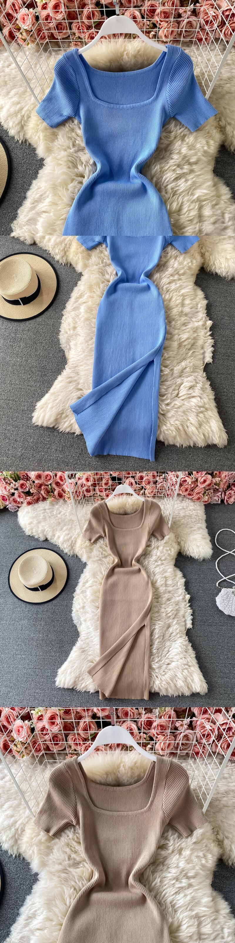 2022 夏ニットスクエアネックスプリットドレス女性の無地スリムセクシーな夏の衣装パーティードレス サマー 夏物 ソリッドカラー スクウェア Abe62513478698