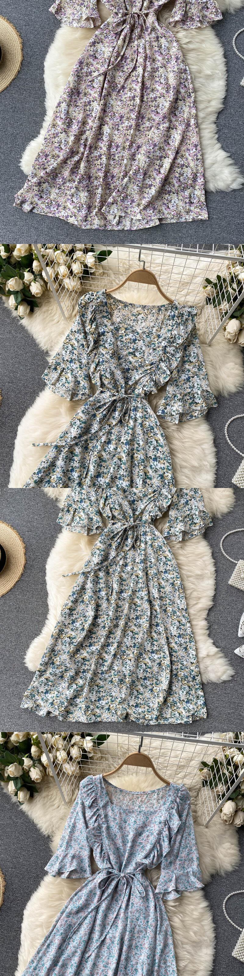 女性シフォン花ドレス甘いスクエア カラー半袖 A ライン ドレス夏自由奔放に生きるプリント バケーション ビーチ ミディ ドレス ショート ハーフスリーブ 大人ガーリー スウィート キュート カジュアル サマー 夏物 花柄 Aライン スクウェア Abe73063149869