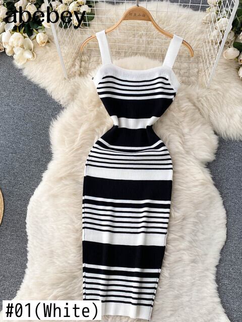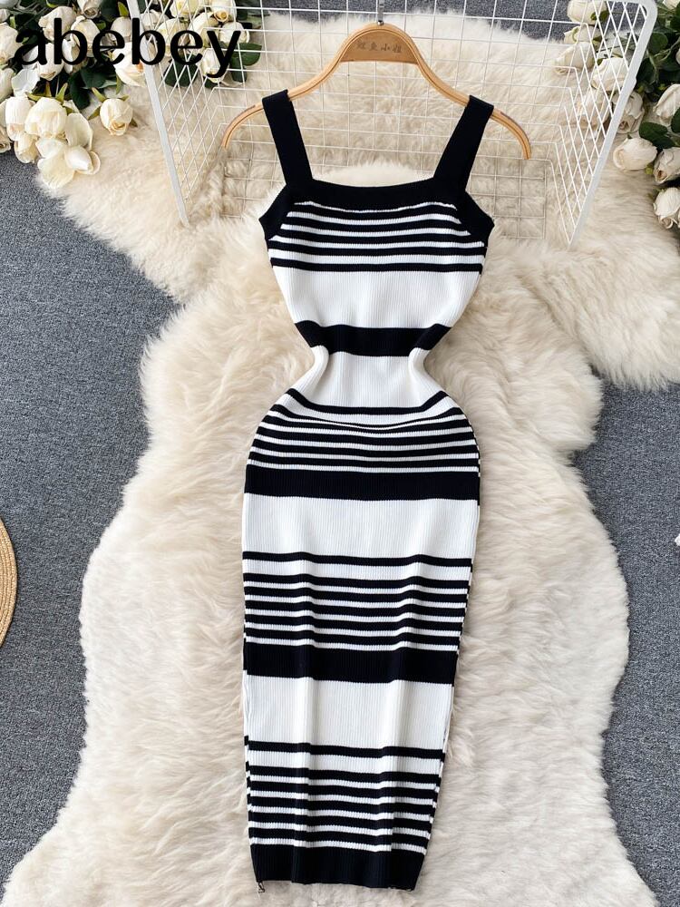 女性の夏のニットドレス 2022 ストラップシックなニットサンドレスパーティースリム A ラインストライプセクシーなドレス サマー 夏物 Aライン Abe32719627721