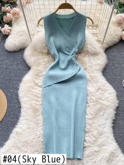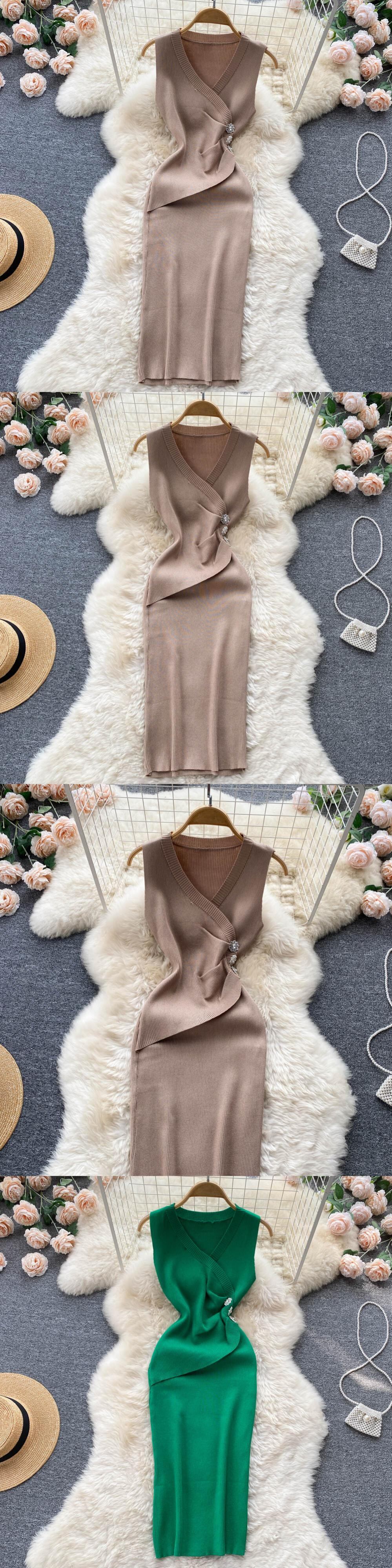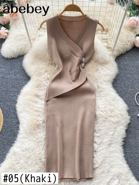 夏ニットセクシーなストラップドレス女性 V ネック Elatic ウエストボディコンサンドレスビーチ bottons ノースリーブロングドレス サマー 夏物 Vネック Abe93541209753