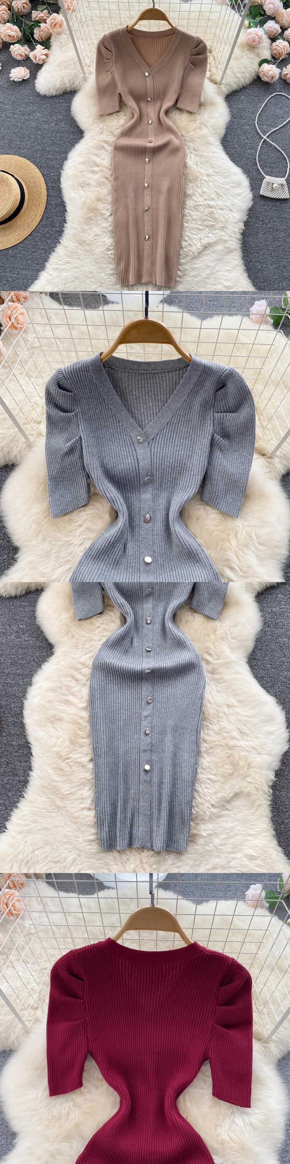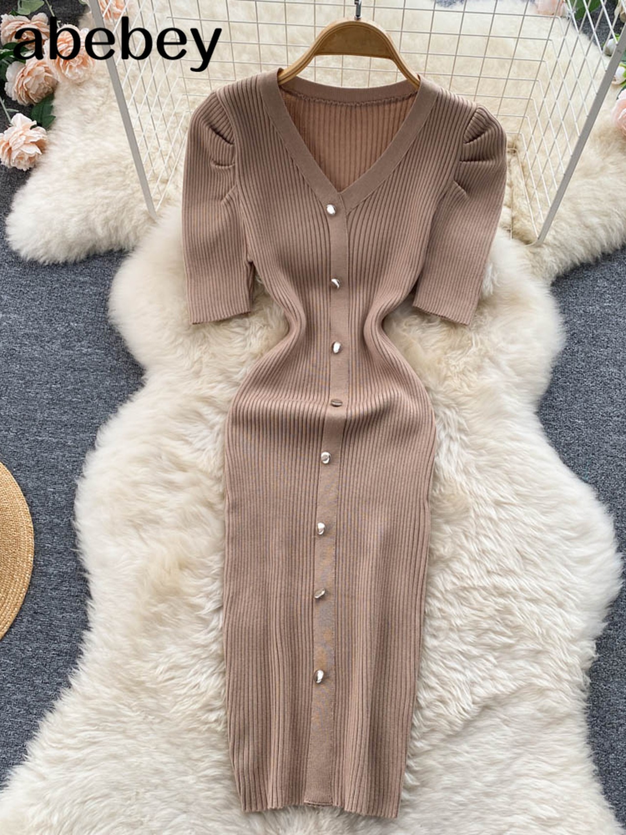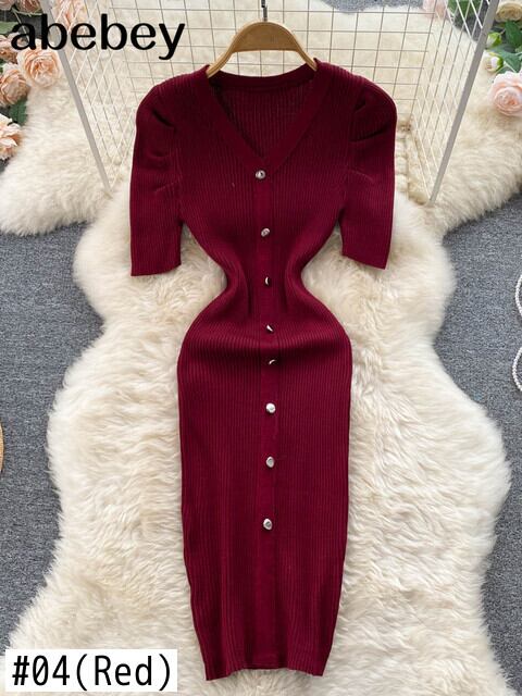 ニット半袖ボディコンミディドレス女性の夏のセクシーな V ネック包帯ストリートソリッドストレッチレディドレス ショート ハーフスリーブ サマー 夏物 Vネック ソリッドカラー Abe66839301575