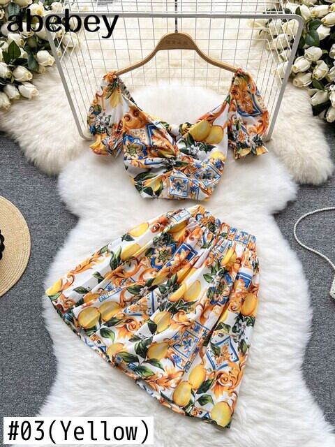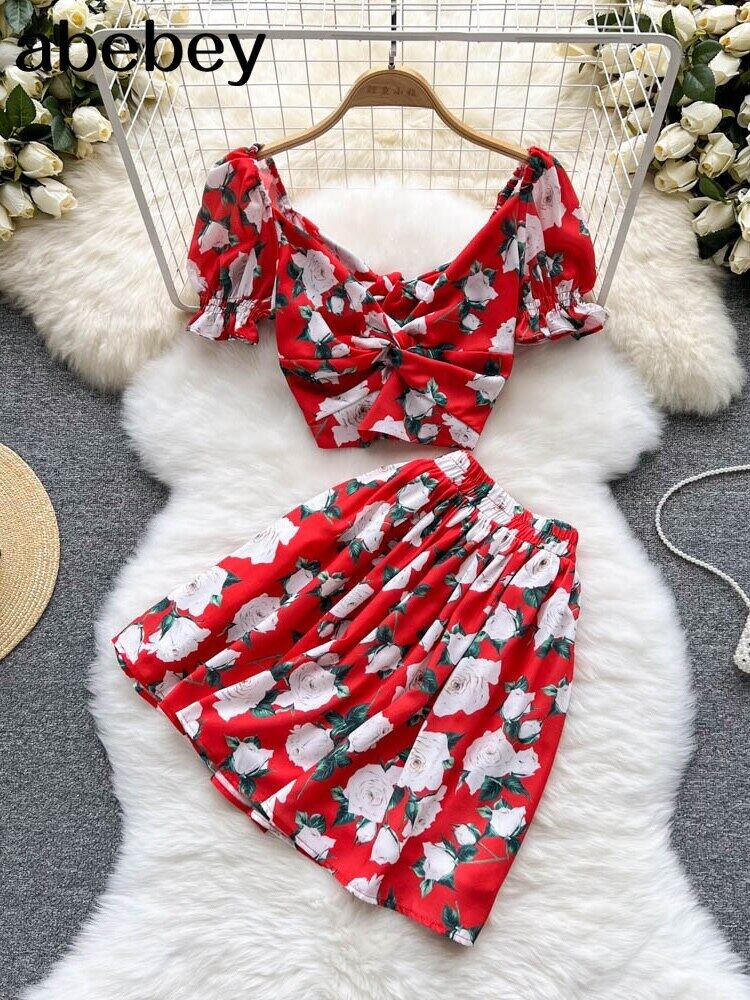 サマー ホリデー フローラル プリント V ネック クロップ トップ シャーリング + ウエスト レディース ショート スカート セット 2022 夏物 花柄 Vネック Abe4807391367