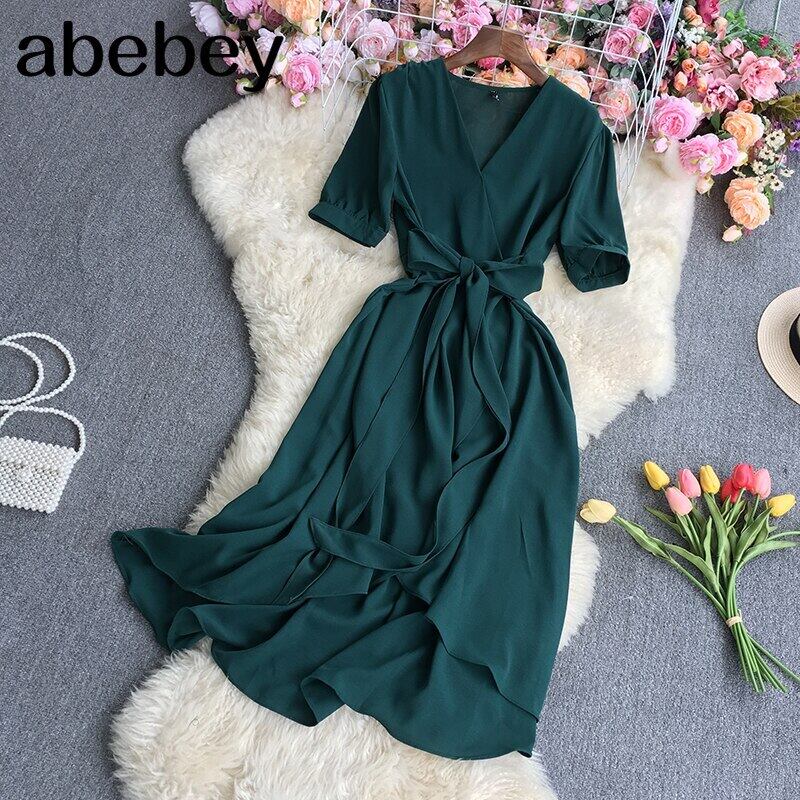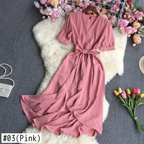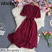 2022 春秋フレンチ V ネック半袖ドレスハイウエストレースアップ不規則なウエスト無地ミッドレングス A ラインドレス ハイウェスト ショート ハーフスリーブ スプリング 春物 オータム 秋物 Vネック Aライン ソリッドカラー Abe24770670328