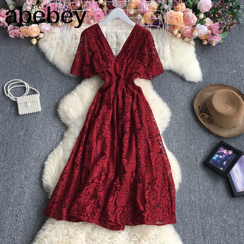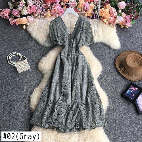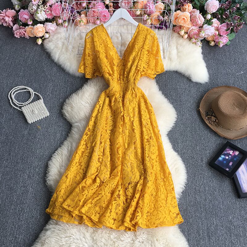 2022 夏の女性の V ネック半袖ドレス中空アウトかぎ針編みハイウエストプリーツミッドロング A ラインのレースのドレス ハイウェスト ショート ハーフスリーブ サマー 夏物 Vネック Aライン Abe25073736101