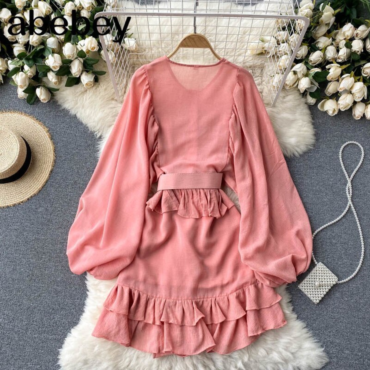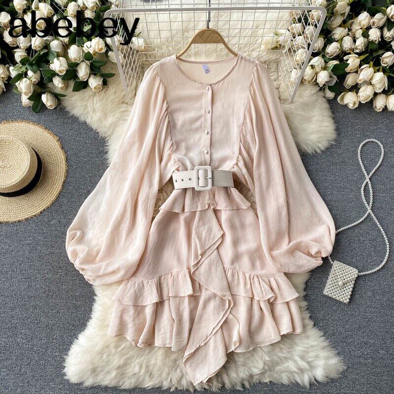 女性ベルト花柄ドレス パフ スリーブ O ネック A ライン ドレス春ボヘミアン無地ミディ ドレス スプリング 春物 ハーネス Oネック Aライン ソリッドカラー Abe37939987958