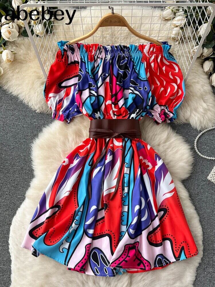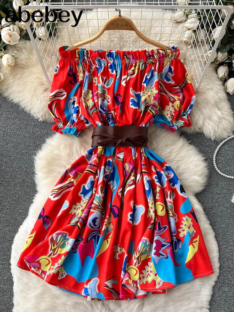 夏フレンチ花柄ドレス女性甘いセクシーなスラッシュネックオフショルダー A ラインミニドレス自由奔放に生きるプリント休暇ビーチサンドレス 大人ガーリー スウィート キュート カジュアル サマー 夏物 Aライン Abe4129336501