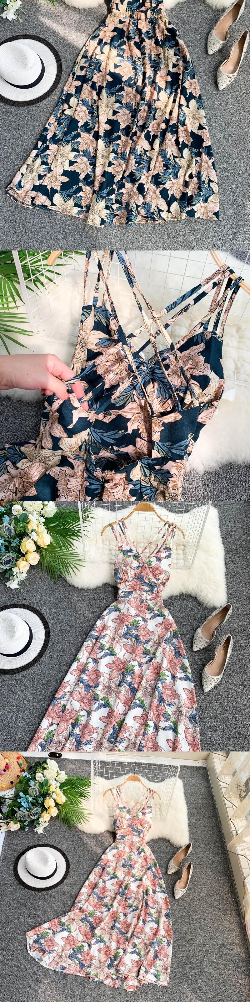 2022 V ネック夏花柄ミディロングドレス背中の開いたスパゲッティストラップ女性ビーチホリデー Vestidos サンドレス サマー 夏物 Vネック Abe95418866172