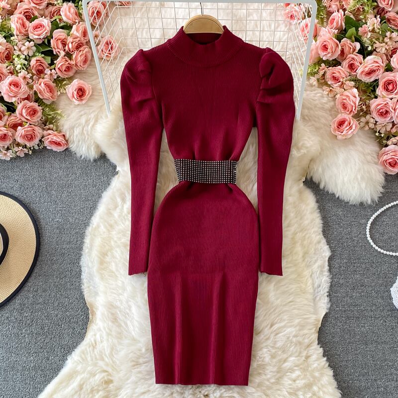 女性弾性ニットドレスレトロパフスリーブスタンドカラーペンシルドレス秋冬ボディコンセータードレス エラスティック 伸縮 オータム 秋物 ウィンター 冬物 Abe39400082676