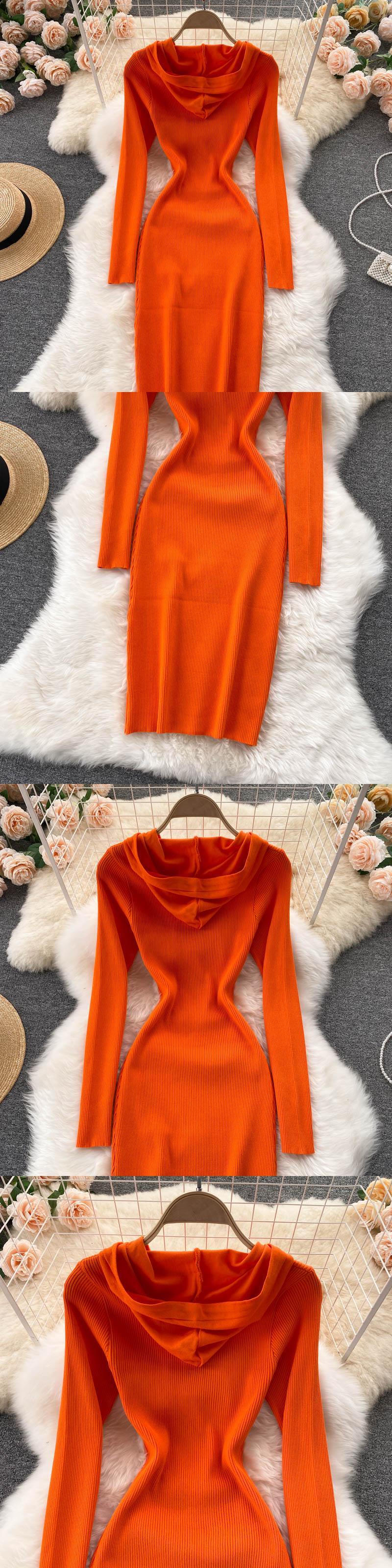 女性フード付きニットドレス長袖ポケット弾性スリムシースドレス秋冬ボディコン暖かいセータードレス ロング エラスティック 伸縮 オータム 秋物 ウィンター 冬物 Abe92444160123