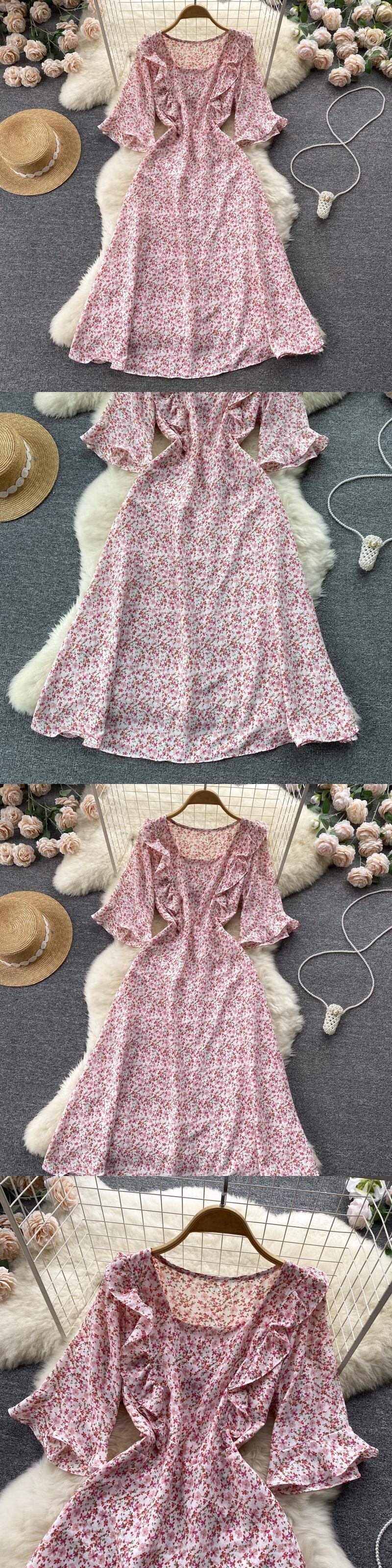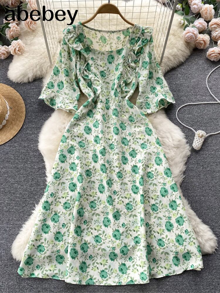 夏 スクエアカラー 花柄 プリント ドレス フレア 半袖 ウエスト バケーション ビーチ ベスト 2022 ショート ハーフスリーブ サマー 夏物 スクウェア Abe71041993224