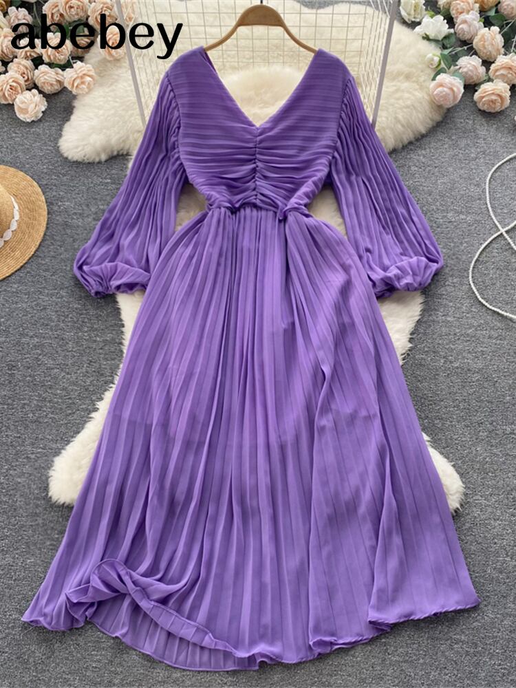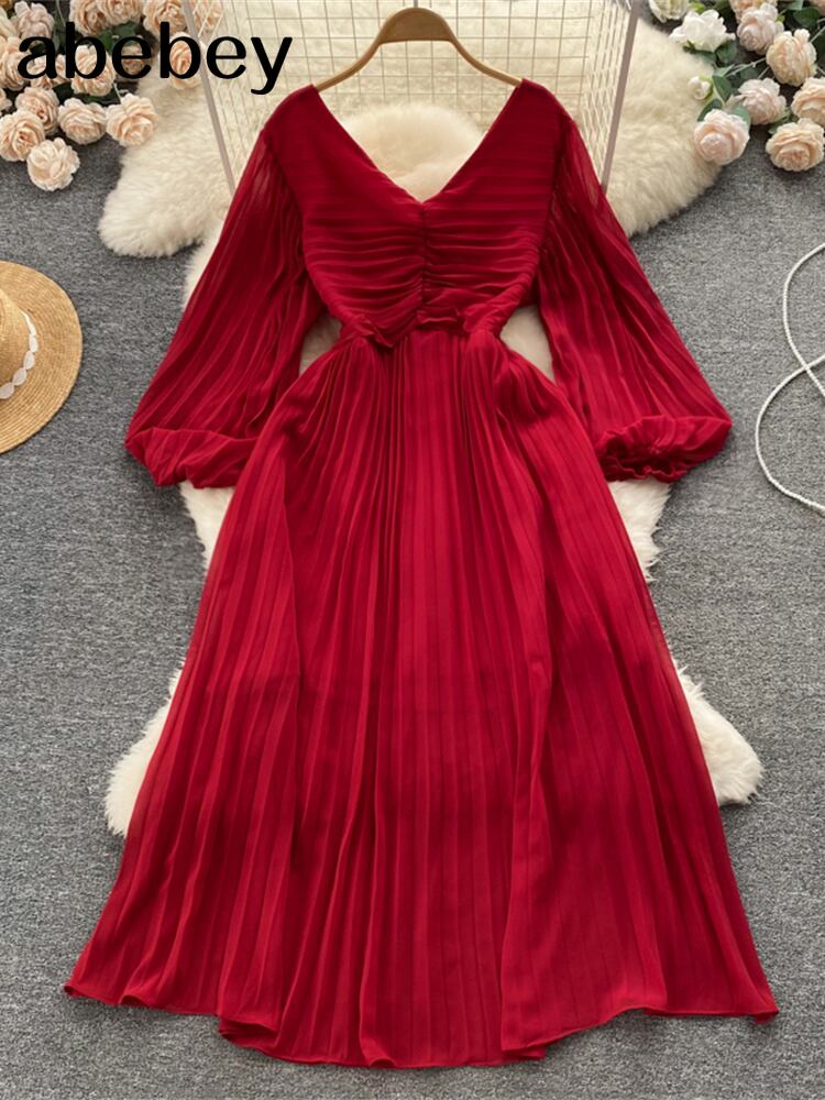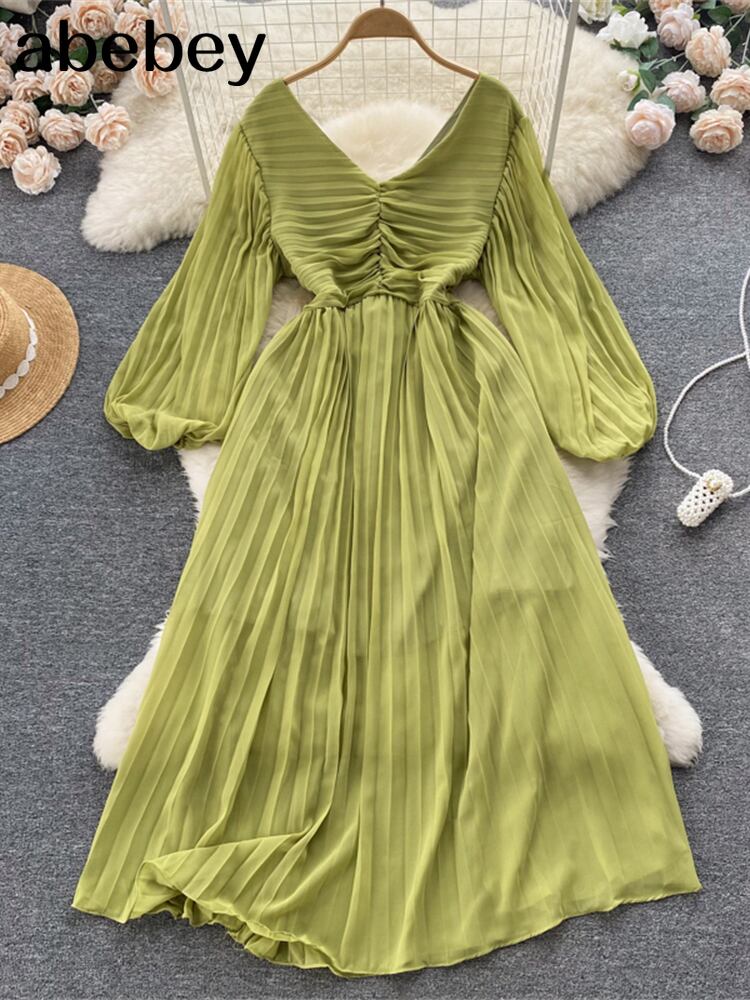 秋の女性プリーツ ロング ドレス V ネック パフ スリーブ ウエスト A ライン ドレープ マキシ Vestidos オータム 秋物 Vネック Aライン Abe34332360934