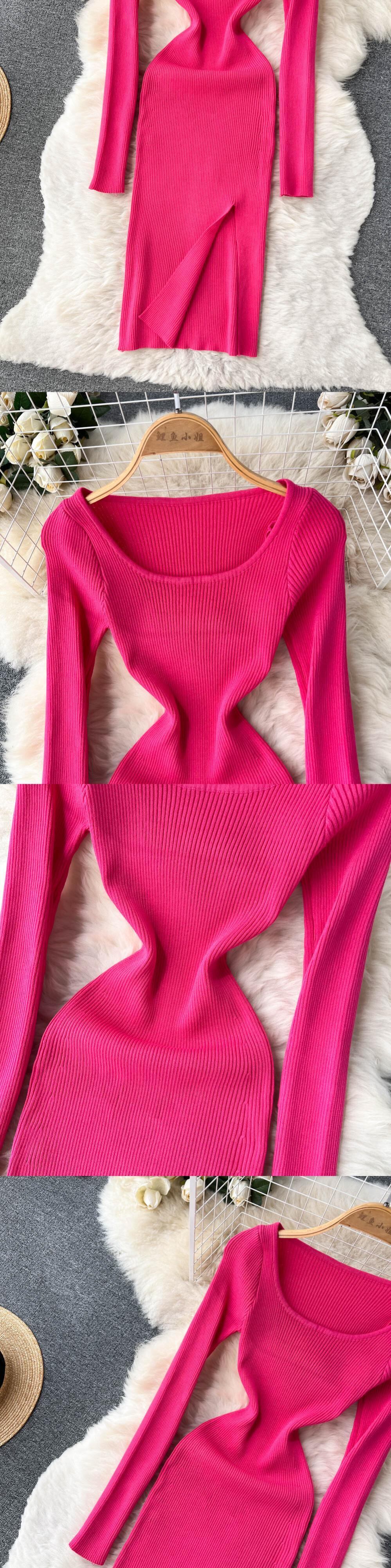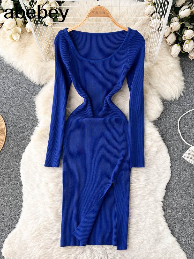 冬のスプリットボディコンニットドレスロングスリーブシーススクエアネックセーター2022パーティーセクシー暖かいドレス 長袖 ウィンター 冬物 スクウェア Abe84957251114