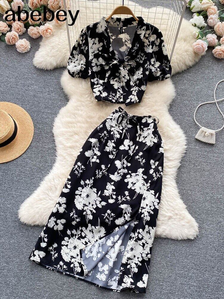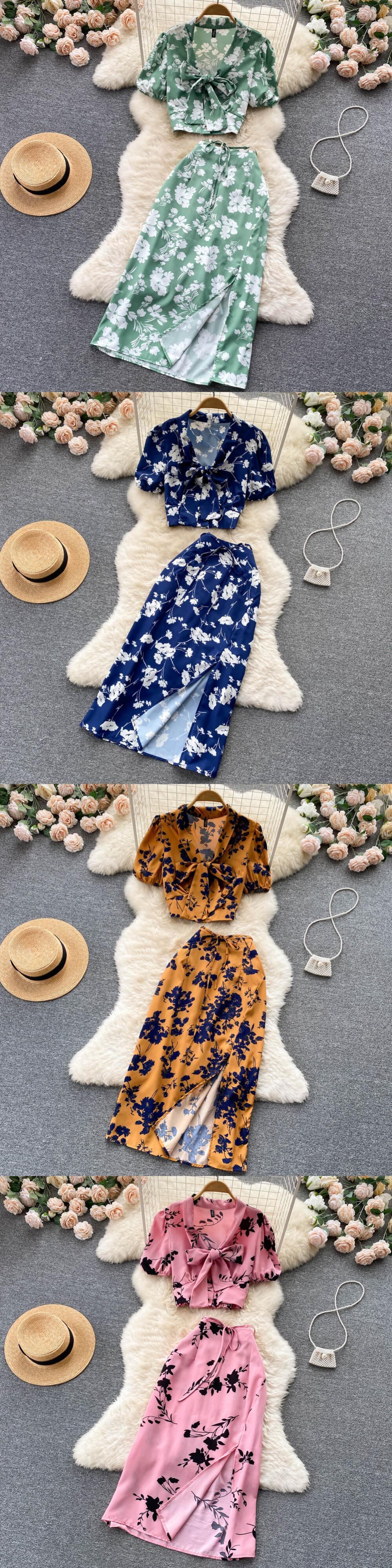 花柄ツーピーススーツ弓ショートシャツトップ + 巾着スプリットドレススーツ女性の夏のビーチセット リボン サマー 夏物 Abe21207866056