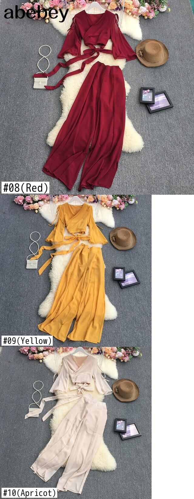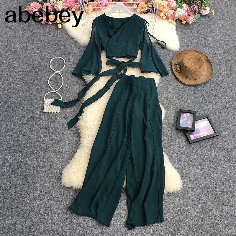 2022春秋Vネックフレアスリーブ包帯ショートシャツトップ+ウエストワイドレッグスプリットパンツ2点セット スプリング 春物 オータム 秋物 ワイドパンツ Abe7022820369