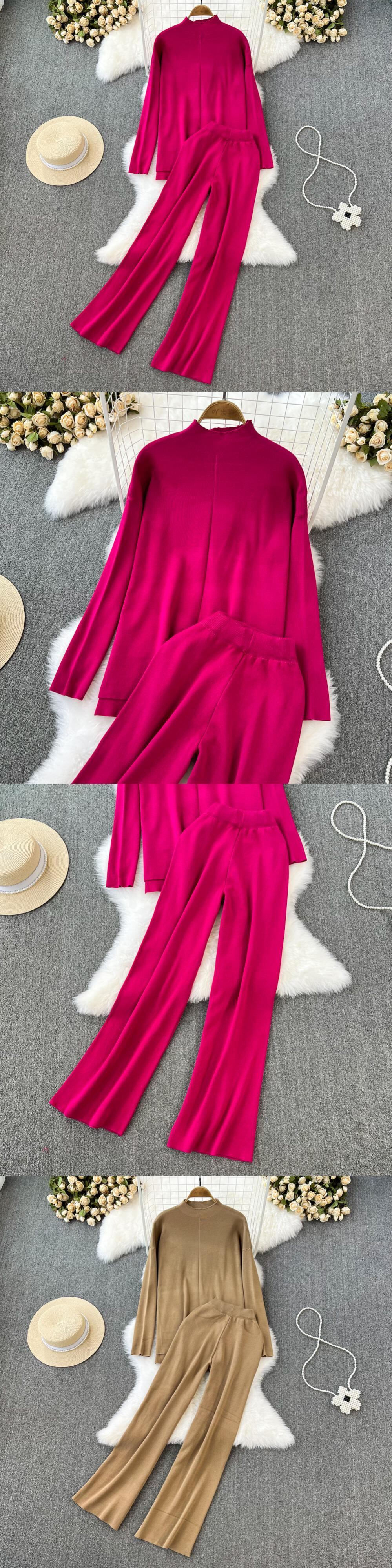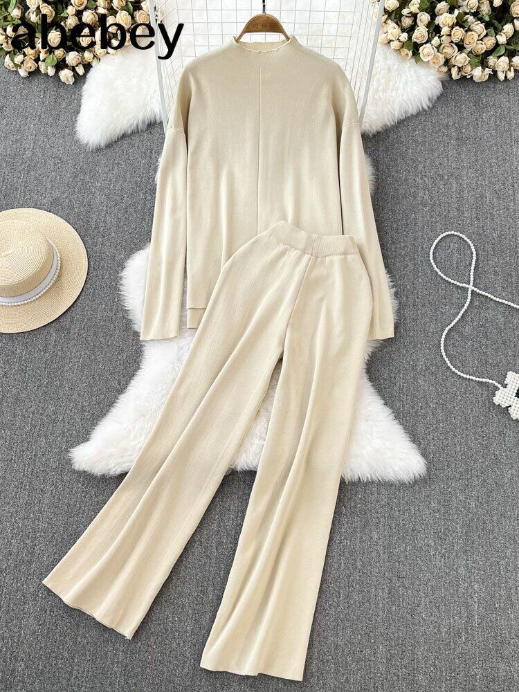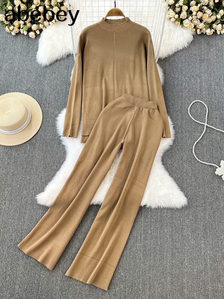 女性ニットツーピースセットグリーン 2022 冬ルーズズボンスーツ長袖トップとワイドレッグパンツ衣装 ロング ウィンター 冬物 ワイドパンツ Abe82459443665