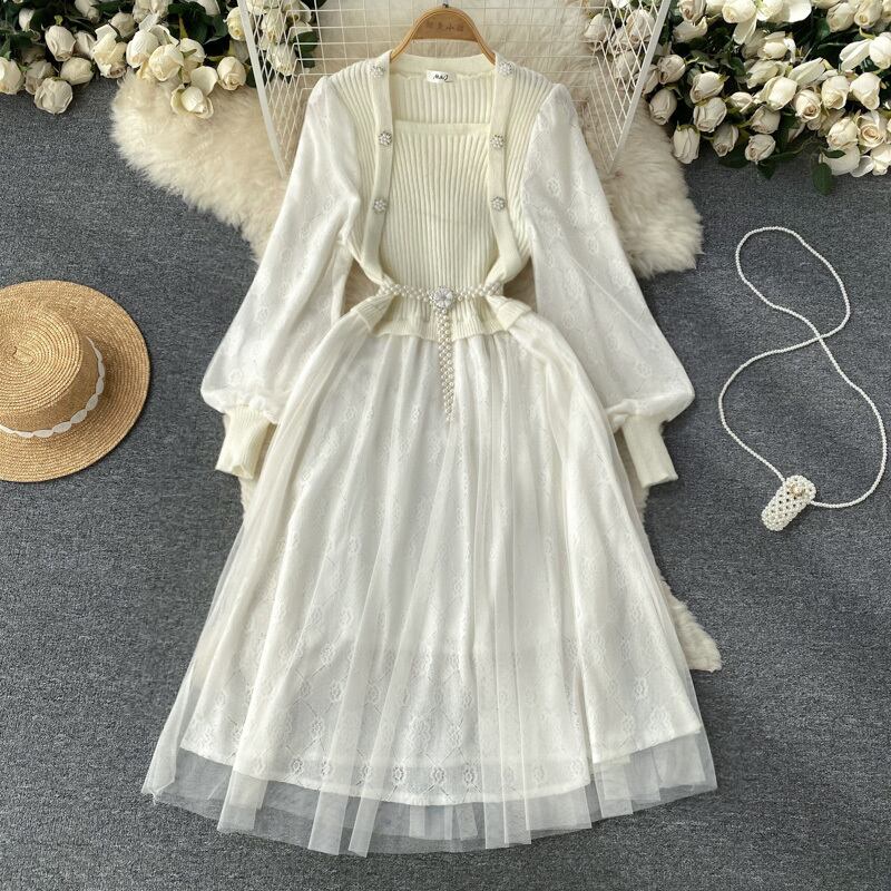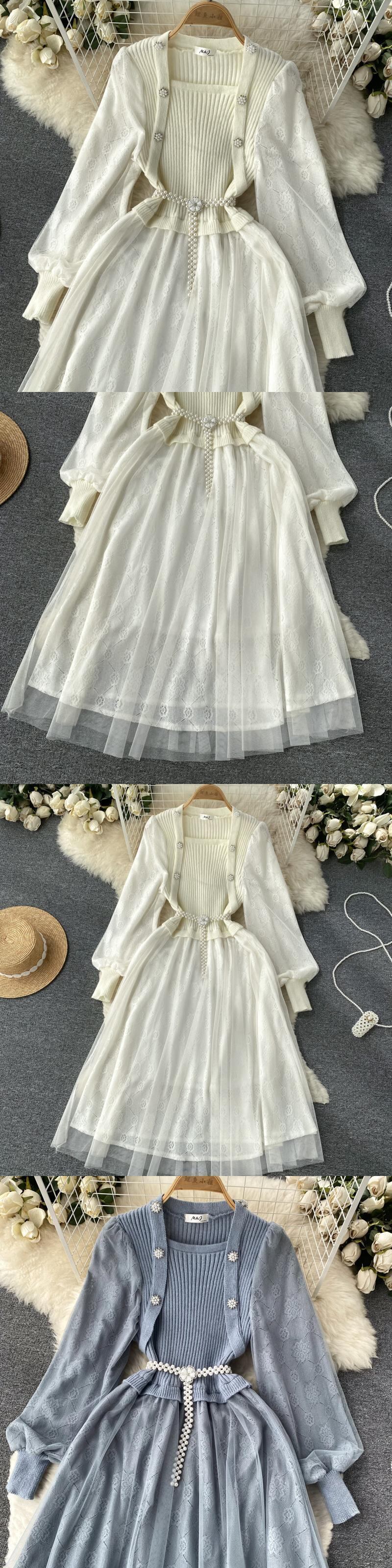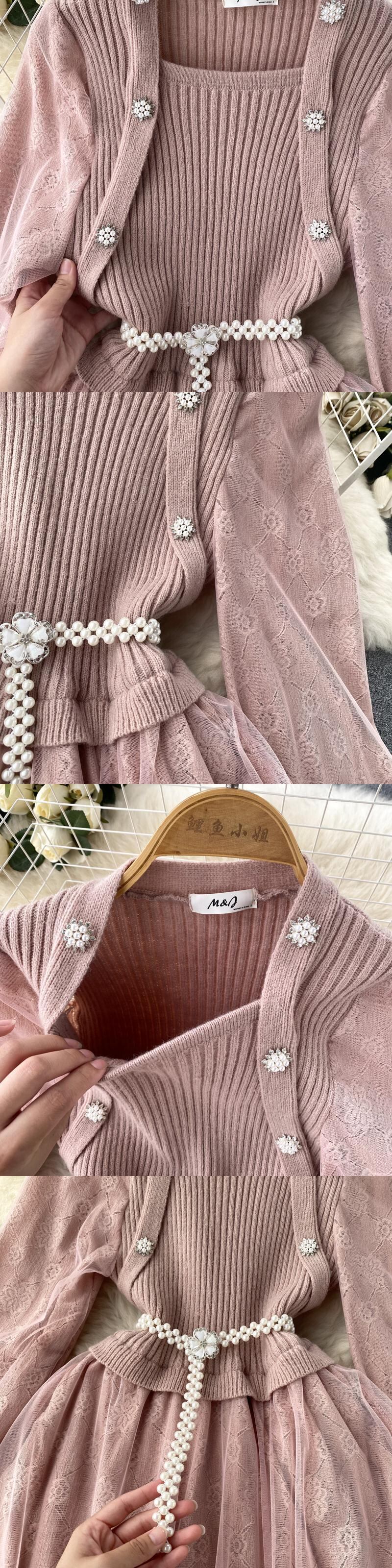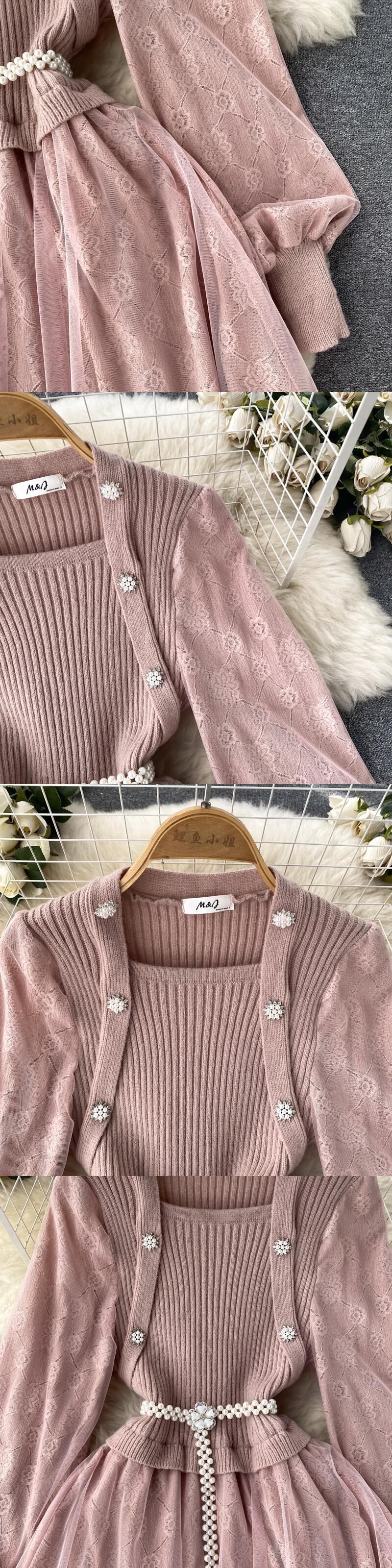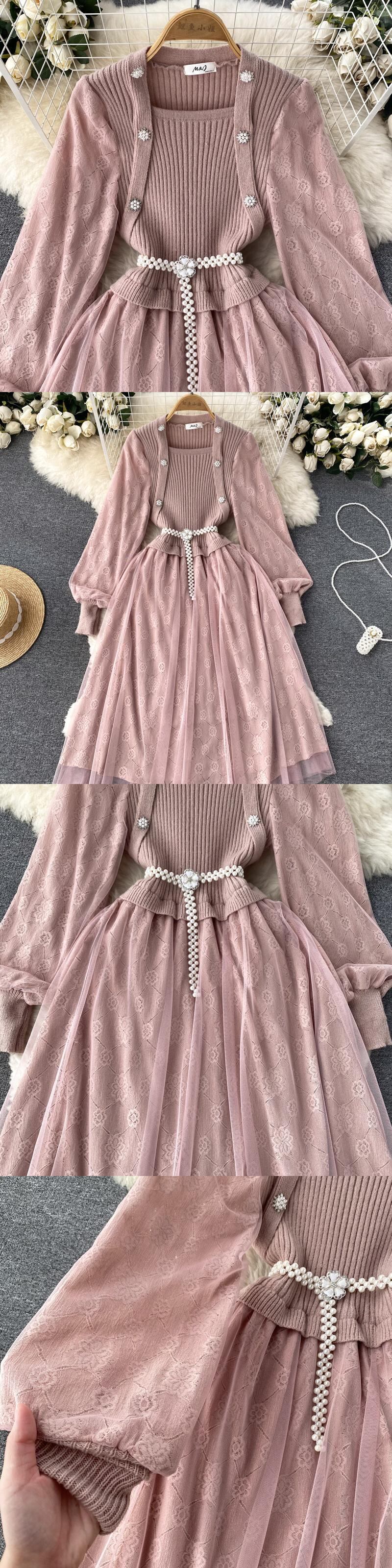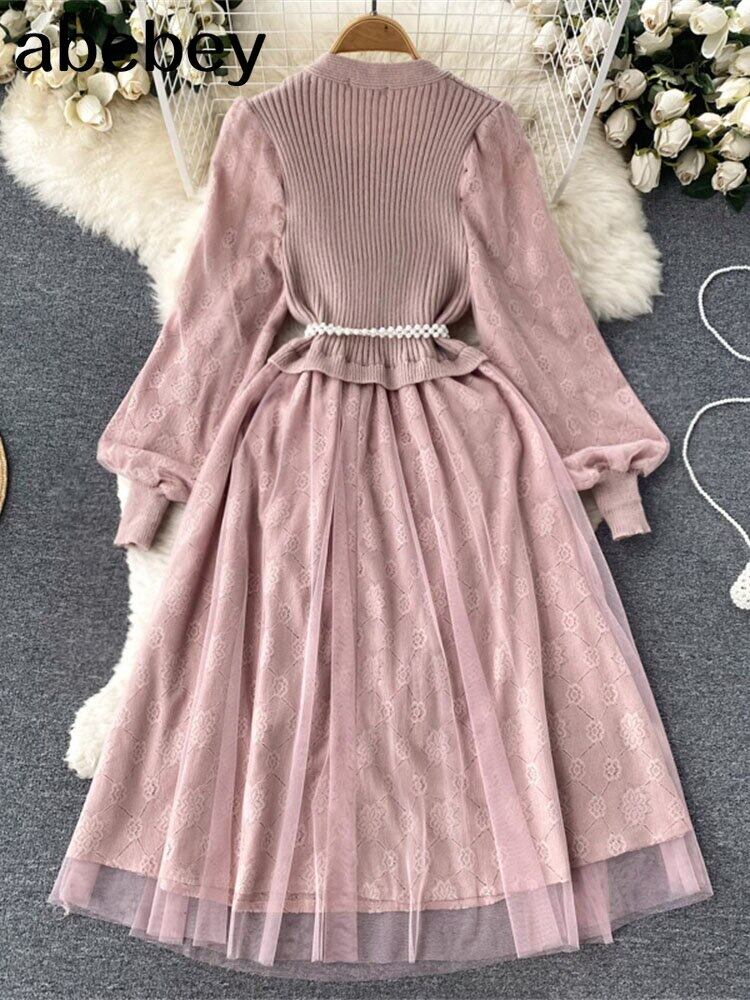 ピンク ビーズ パッチワーク メッシュ セクシーなニット ドレス長袖スリム A ライン パーティー ボディコン セーター ミディ ドレス ロング Aライン Abe95859486362