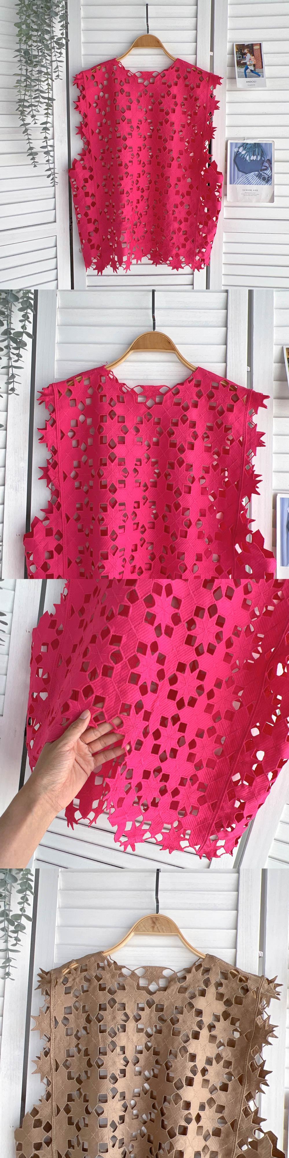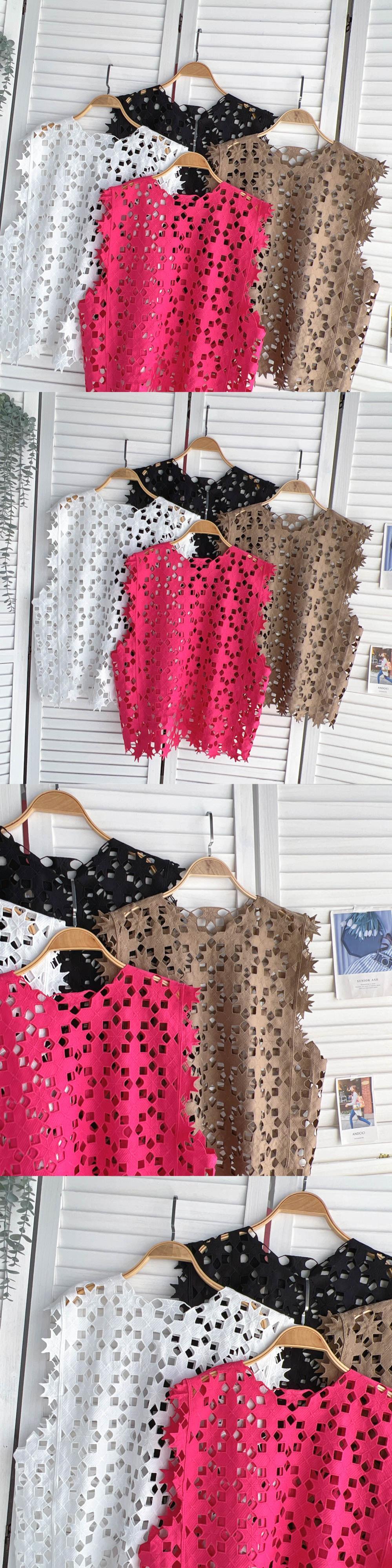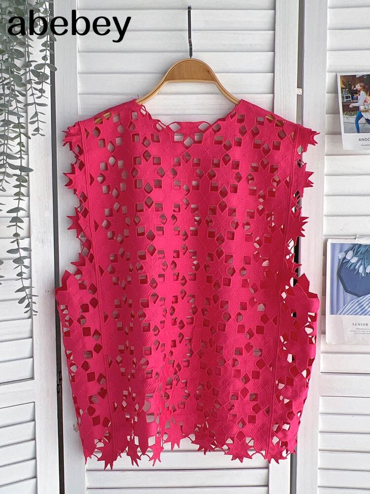 レッド レディース ベスト 2022 レース 中空アウト ノースリーブ Oネック プルオーバー トップス 因果 Sumemr ウエストベスト Abe6335407839