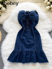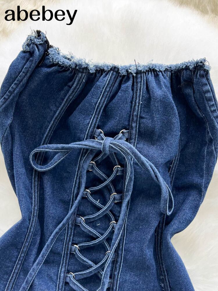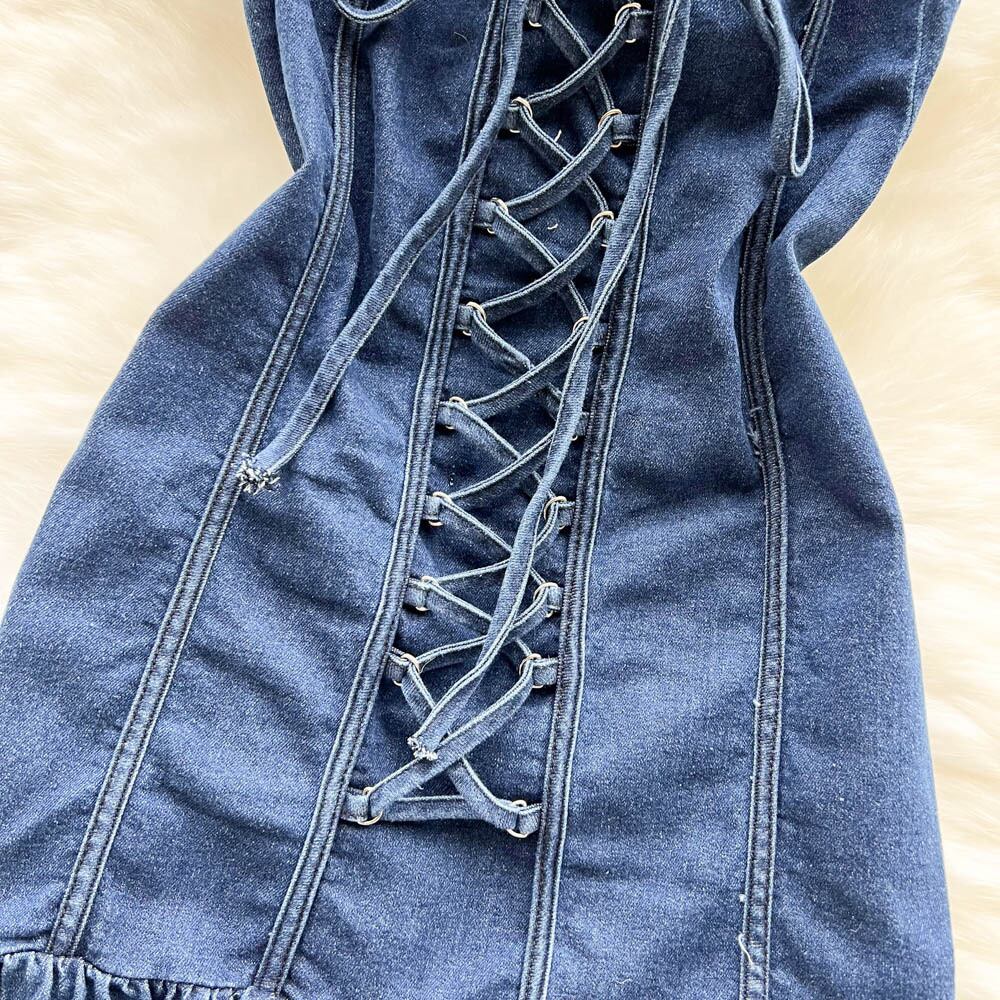 女性デニムドレスヒップパッケージ弾性巾着レースアップスパゲッティ Starp ミニボディコン Vestidos セクシーなストリート服 エラスティック 伸縮 Abe12442043047