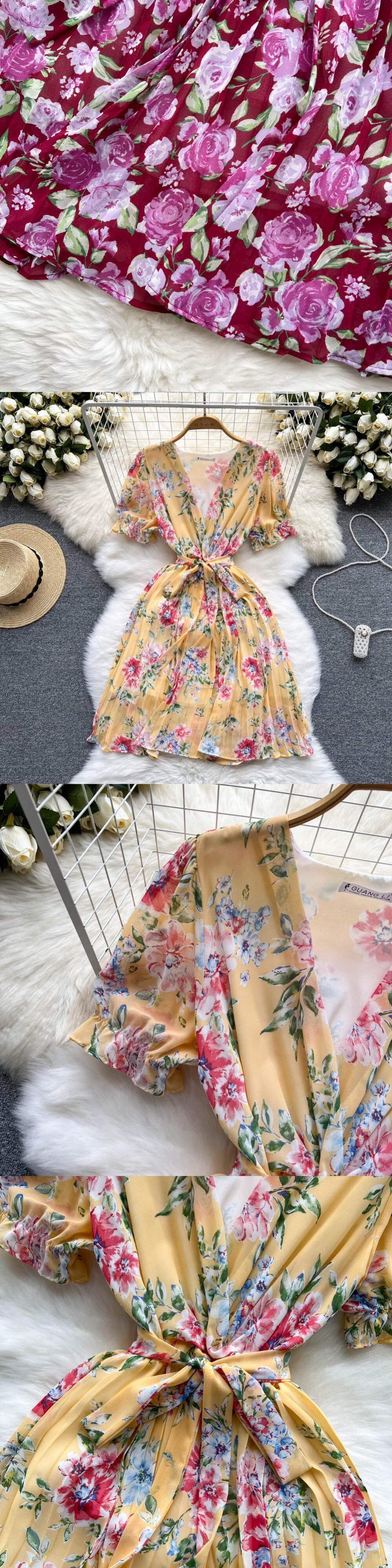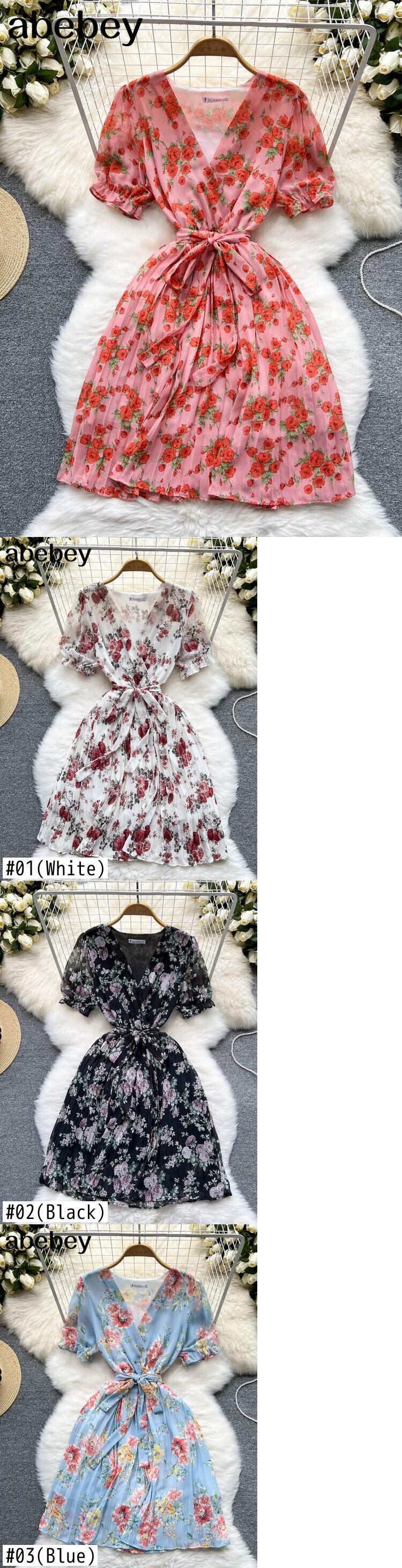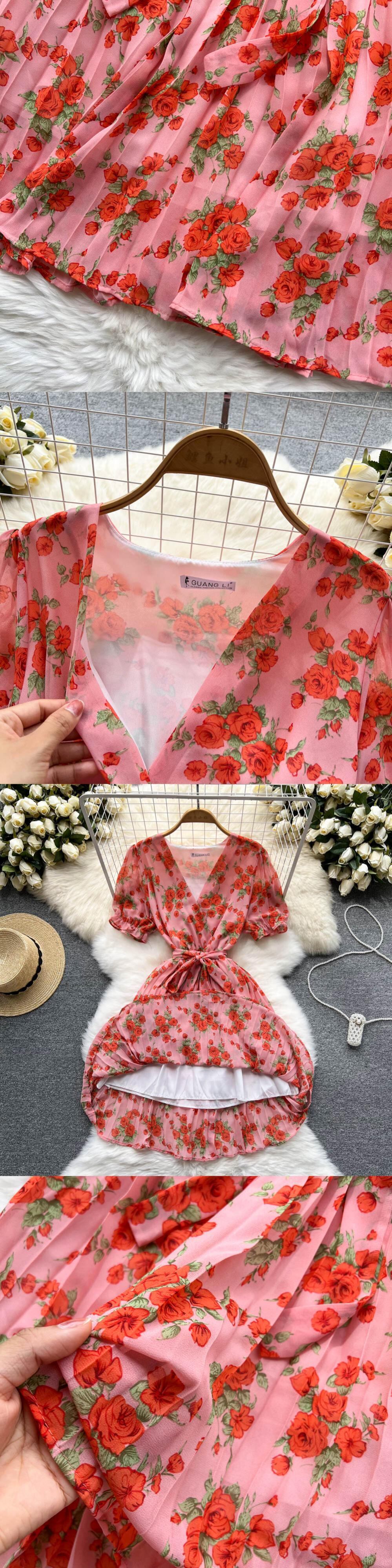 夏のボヘミアンプリントシフォンドレスの女性のセクシーな V ネックショート半袖ウエスト A ラインフリルビーチ Vestidos ハーフスリーブ サマー 夏物 Vネック Aライン Abe36008110626