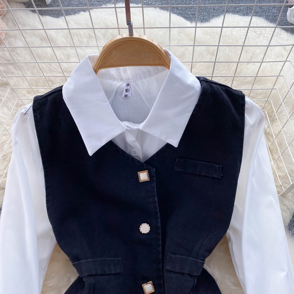 2022 秋ドレス二枚スーツラフスリーブ白シャツドレス + ミニデニムキャミソールスーツ女性ストリートスリムセット ホワイト オータム 秋物 Abe97723345963